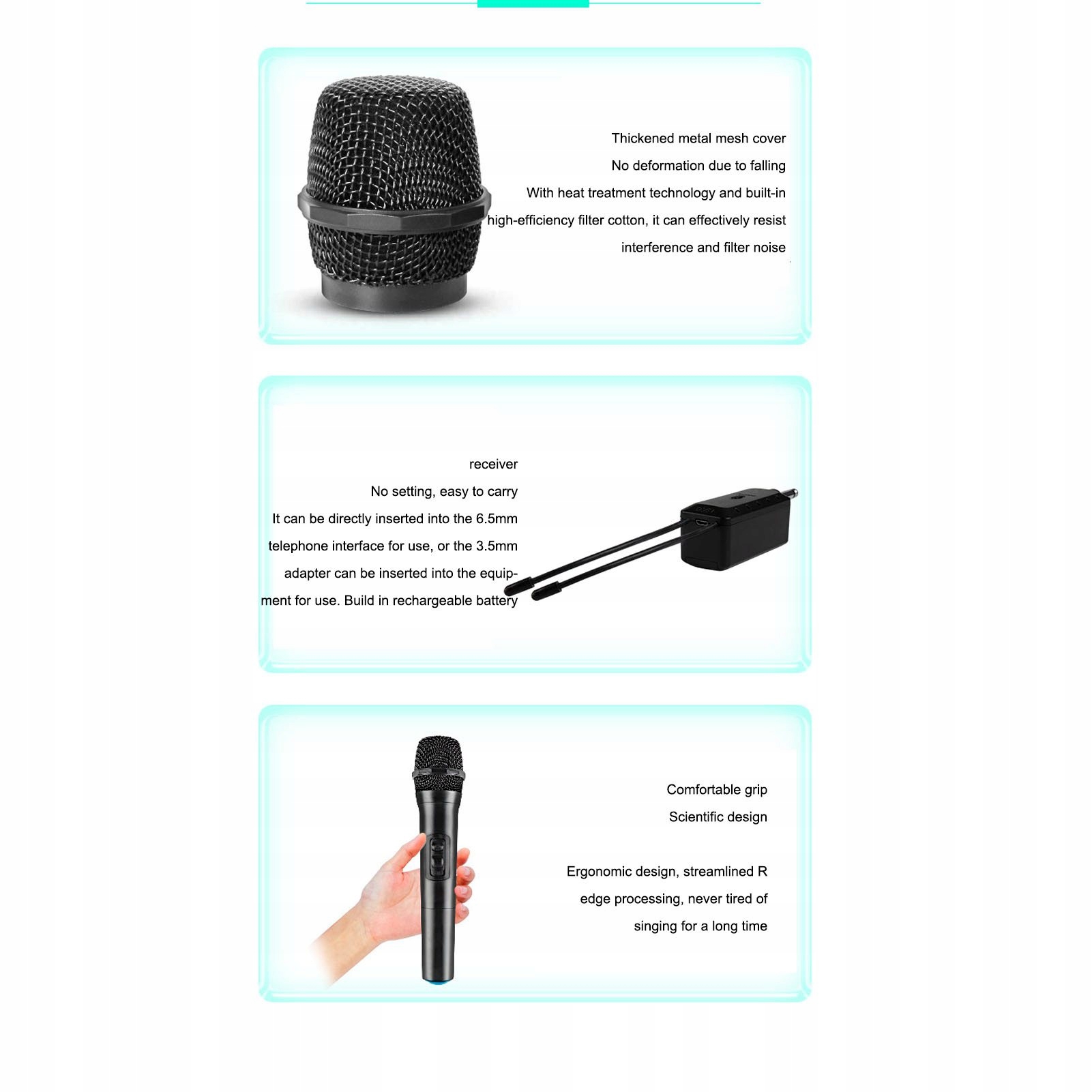 2. Удобная ручка: беспроводной микрофон имеет эргономичный дизайн, обтекаемую форму, его удобно держать, и вы не устанете петь в течение длительного времени.