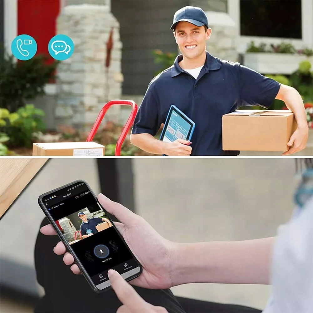 【Прямое видео высокой четкости/двусторонняя аудиосвязь】Аудио и видео этого беспроводного умного дверного звонка Wi-Fi идеально синхронизированы. Он обеспечивает двустороннюю связь и видео в реальном времени благодаря интеллектуальному шумоподавлению и технологии адаптивного битрейта.