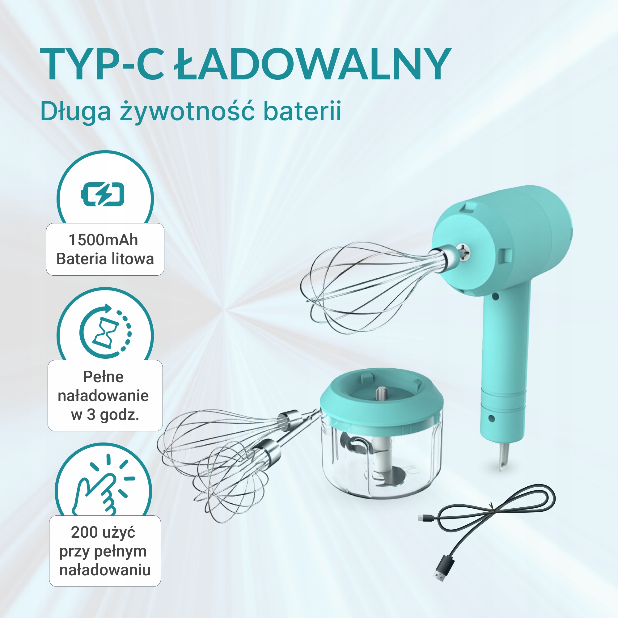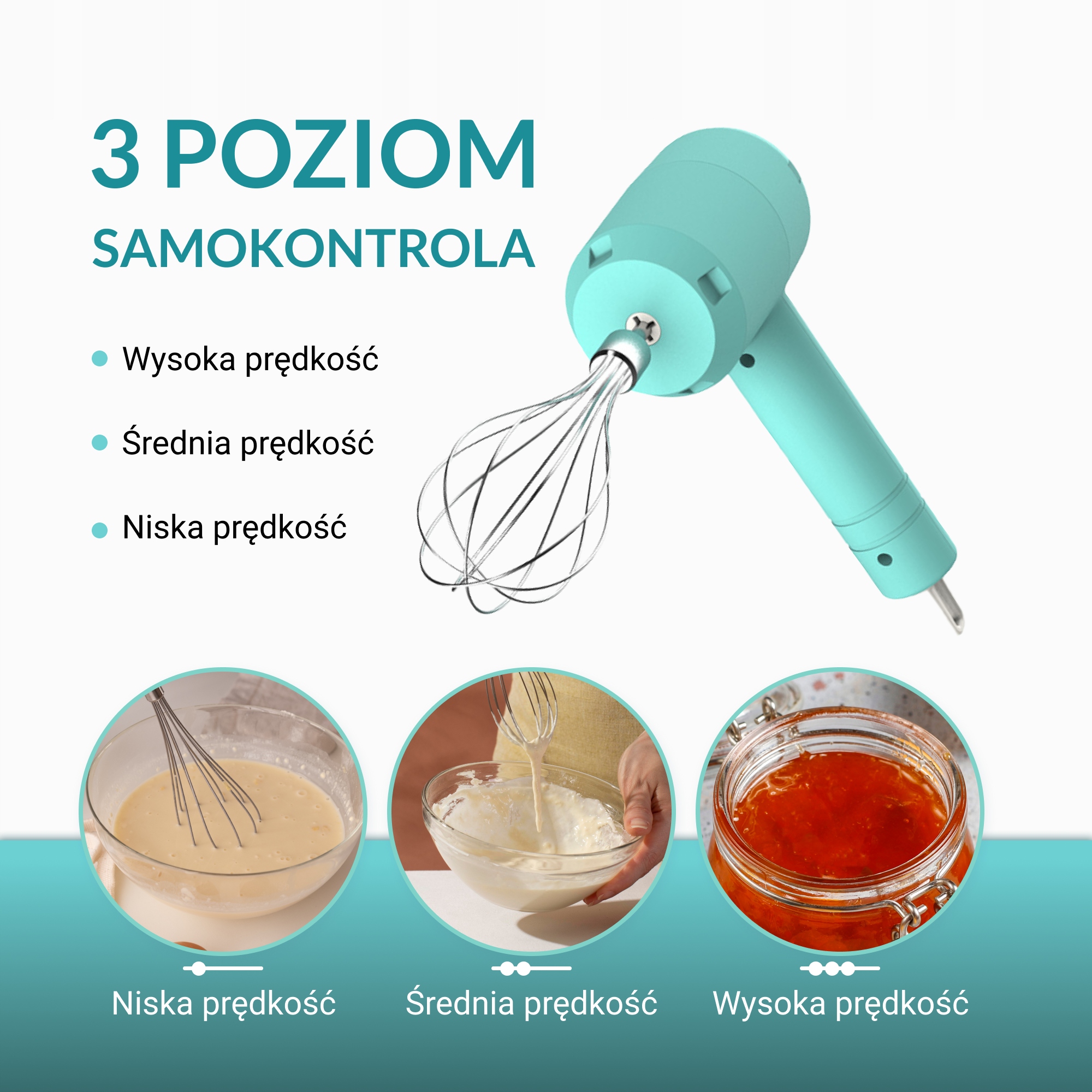 Благодаря беспроводной работе и трем уровням скорости, устройство обеспечивает максимальный комфорт и производительность при приготовлении пищи. В идеале подходит для смешивания ингредиентов, взбивающих сливок, приготовления соусов, нарезания фруктов, овощей и даже мяса.
