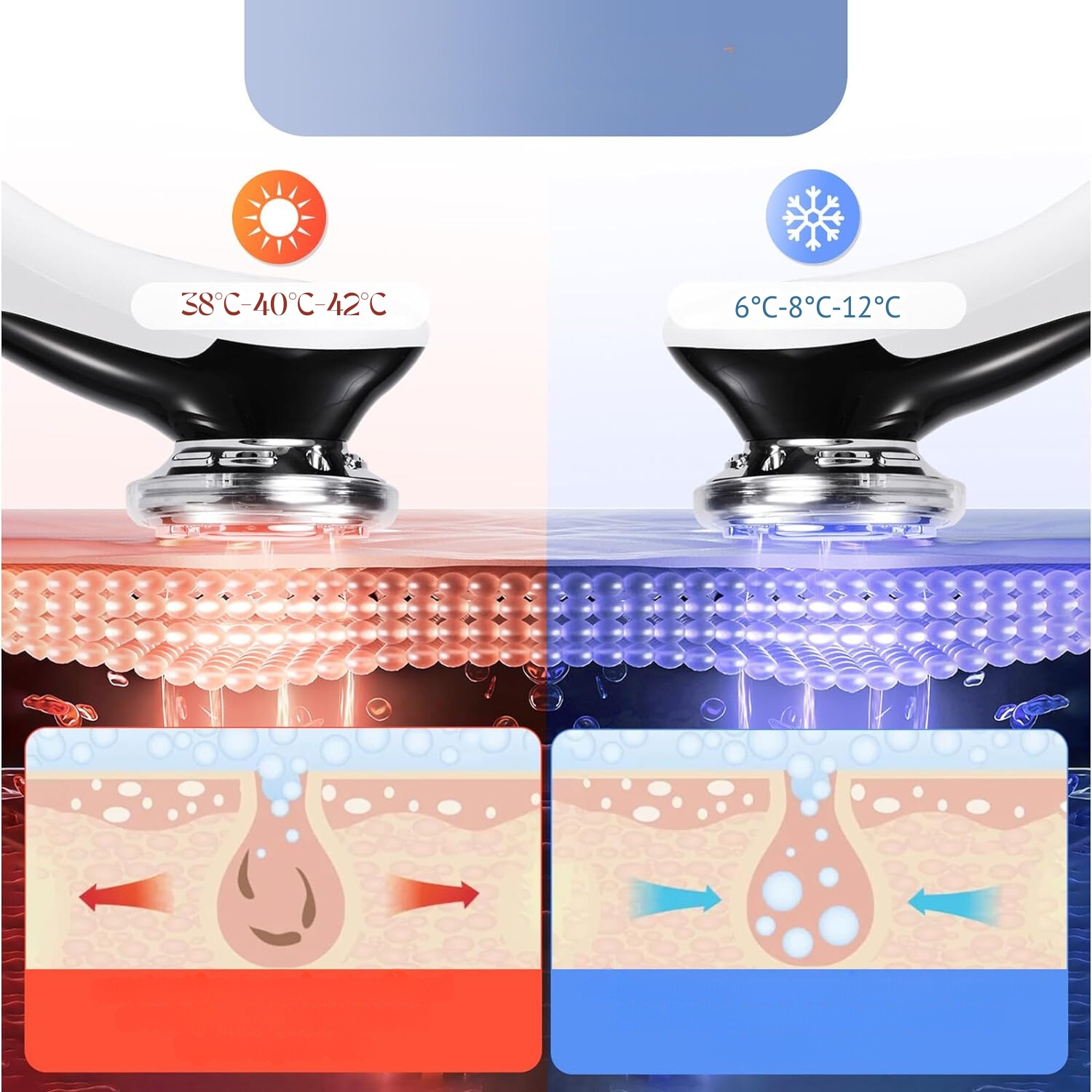 Прибор предлагает горячо-холодную терапию, которая расслабляет и сужает поры, стимулирует кровообращение и обмен веществ, устраняет темные круги под глазами, разглаживает морщины и придает коже сияние.
