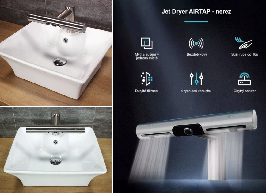 Инновационная сушилка Airtap Design Devision - круглый подключает ручную сушилку с автоматической аккумулятором для воды. Благодаря этому вы можете комфортно вымыть и высушить руки в одном месте - прямо в раковине. Jet Dryer Airtap - Round оснащен фильтром HEPA. Аккумулятор и сушилка бесконтактны для максимальной гигиены труда. Из -за того, что у каждой раковины есть своя сушилка, работа в туалетах жидко и лишена очередей.