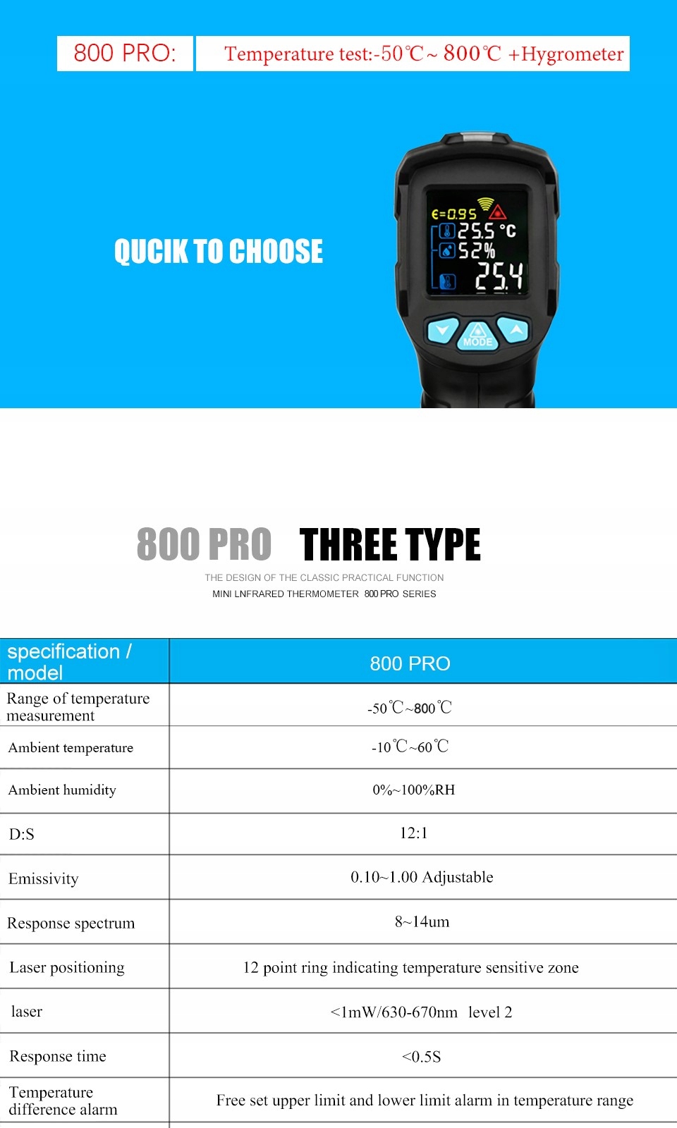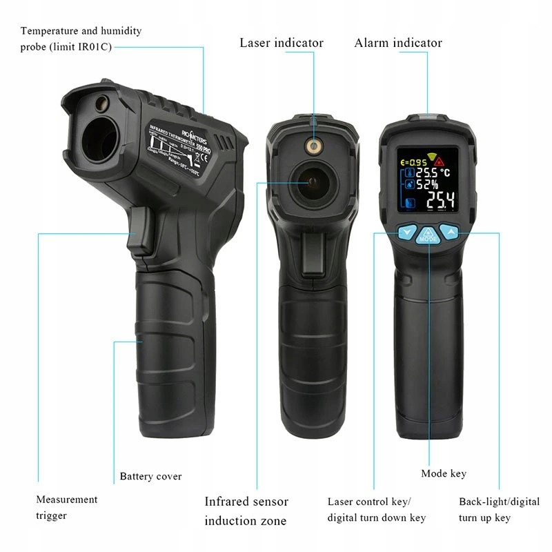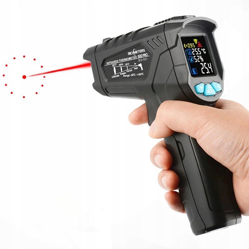 Предлагаем профессиональный цифровой бесконтактный измеритель температуры и влажности/инфракрасный пирометр с лазерным прицелом с диапазоном измерения температуры -50...+800 градусов С > и 0..100 % относительной влажности известного бренда Richmeters, типа RM-800Pro. Прибор имеет возможность регулировки коэффициента излучения в диапазоне 0,1...1,0.