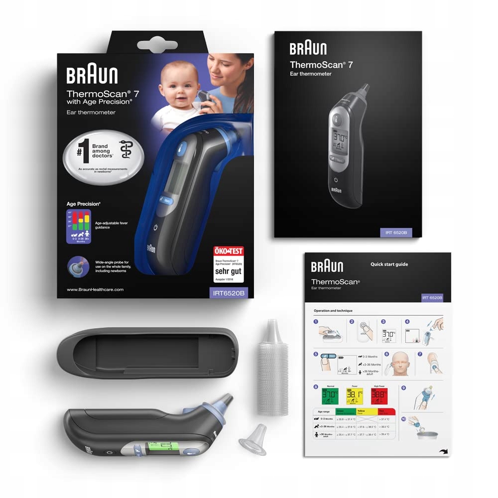 <р> Продюсер: Елена Троянская <р> Номер модели: IRT6520BWE <р> Размеры изделия: 4,5 х 2,49 х 11,5 см; 299 гр <р> ASIN: B07KVNC3SW <р> Цвет: Черный <р> Возрастной диапазон (описание): Для детей и взрослых <р> Тип дисплея: цифровой <р> Источник питания: аккумулятор. <р> Название модели: Ушной термометр Braun ThermoScan 7 от Age Precision <р> Количество батареек: 2 АА✅Кое-что о нашей продукции..