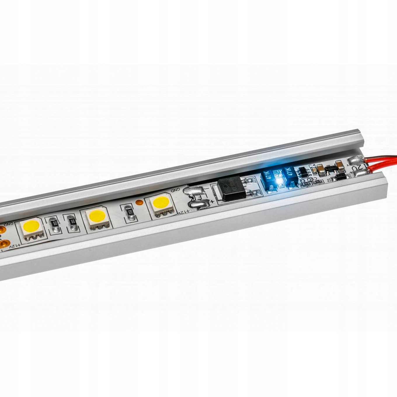 Бесконтактный переключатель для монтажа внутри профиля. Поддерживает ленточные секции мощностью не более 60Вт. У него нет функции затемнения. О готовности к работе сигнализирует синий светодиод. Это также облегчает поиск выключателя в ночное время. Не подключайте выключатель под напряжением. Первый запуск должен осуществляться при закрытой крышке.