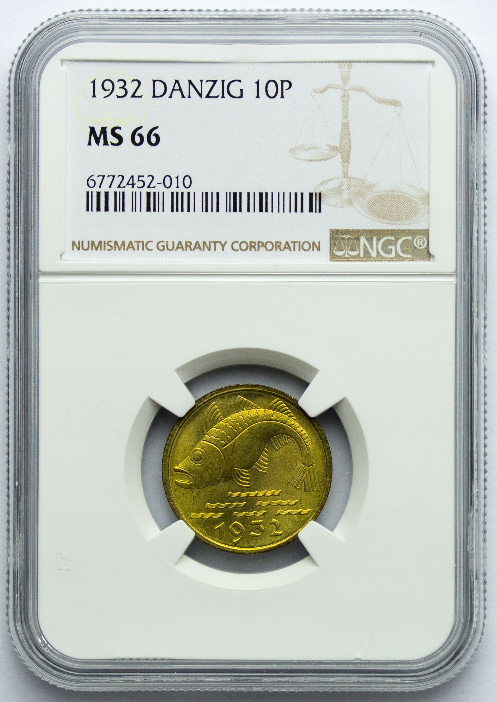 Бесплатный город Гданьск, 10 Pfennigs 1932, Cod, NGC MS66, 2 -я нота, замечательное