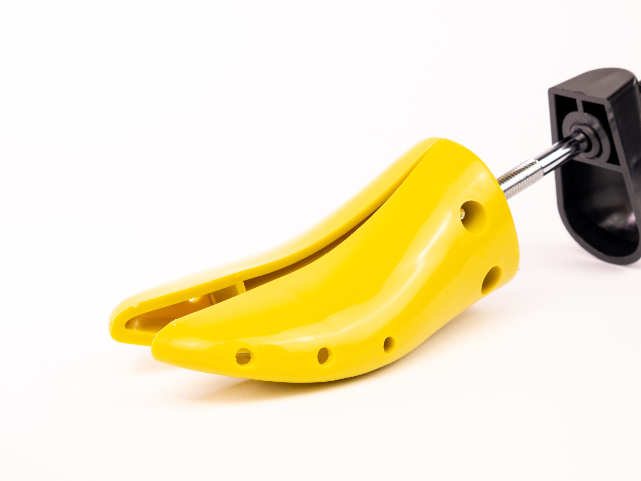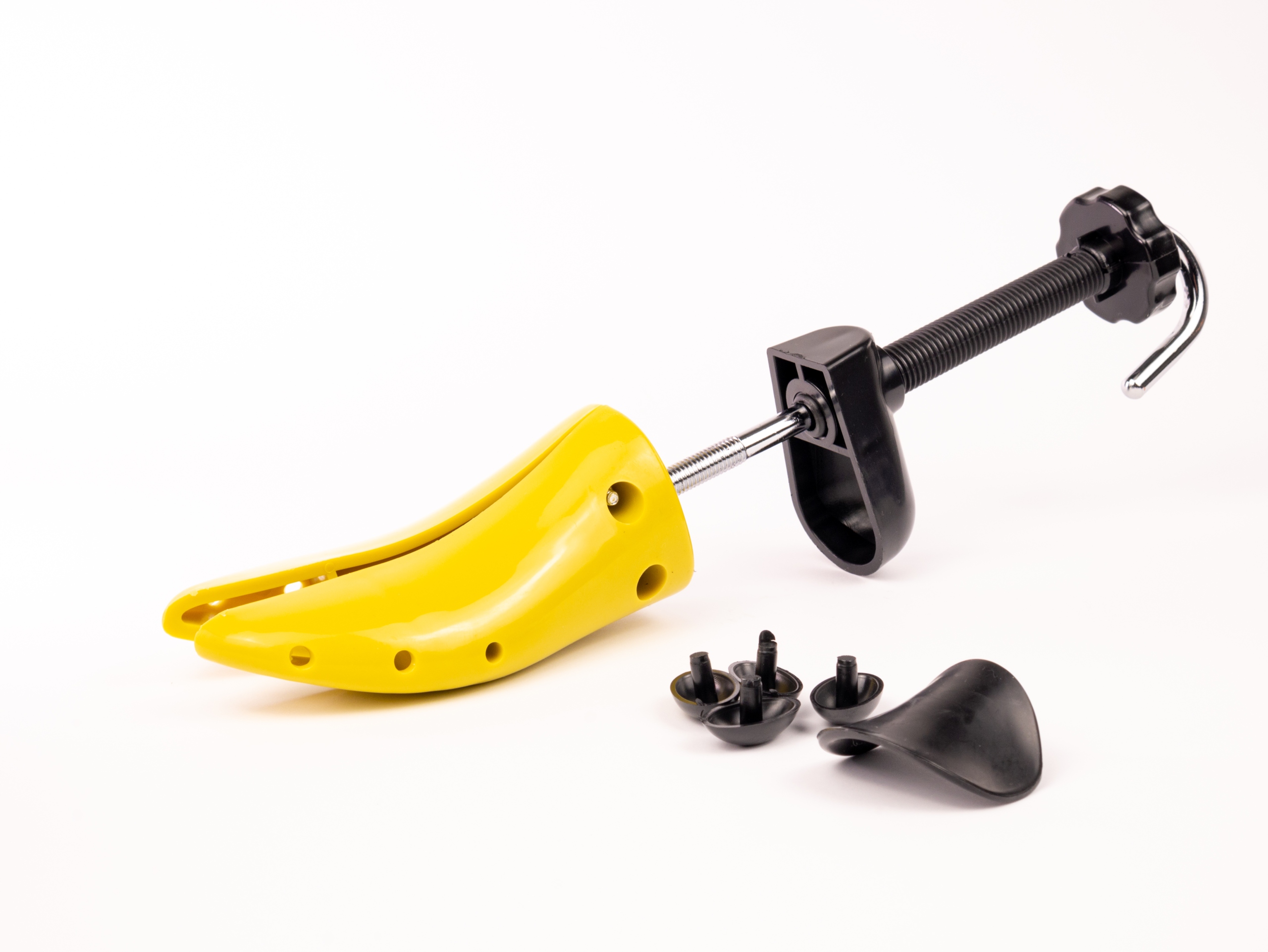 Съемные черные пластиковые чехлы позволяют растянуть обувь в определенном месте, как отмечено на фото. Там, где обувь давит сильнее всего или неудобно, поместите накладку и аккуратно выкрутите колодку на нужную ширину.