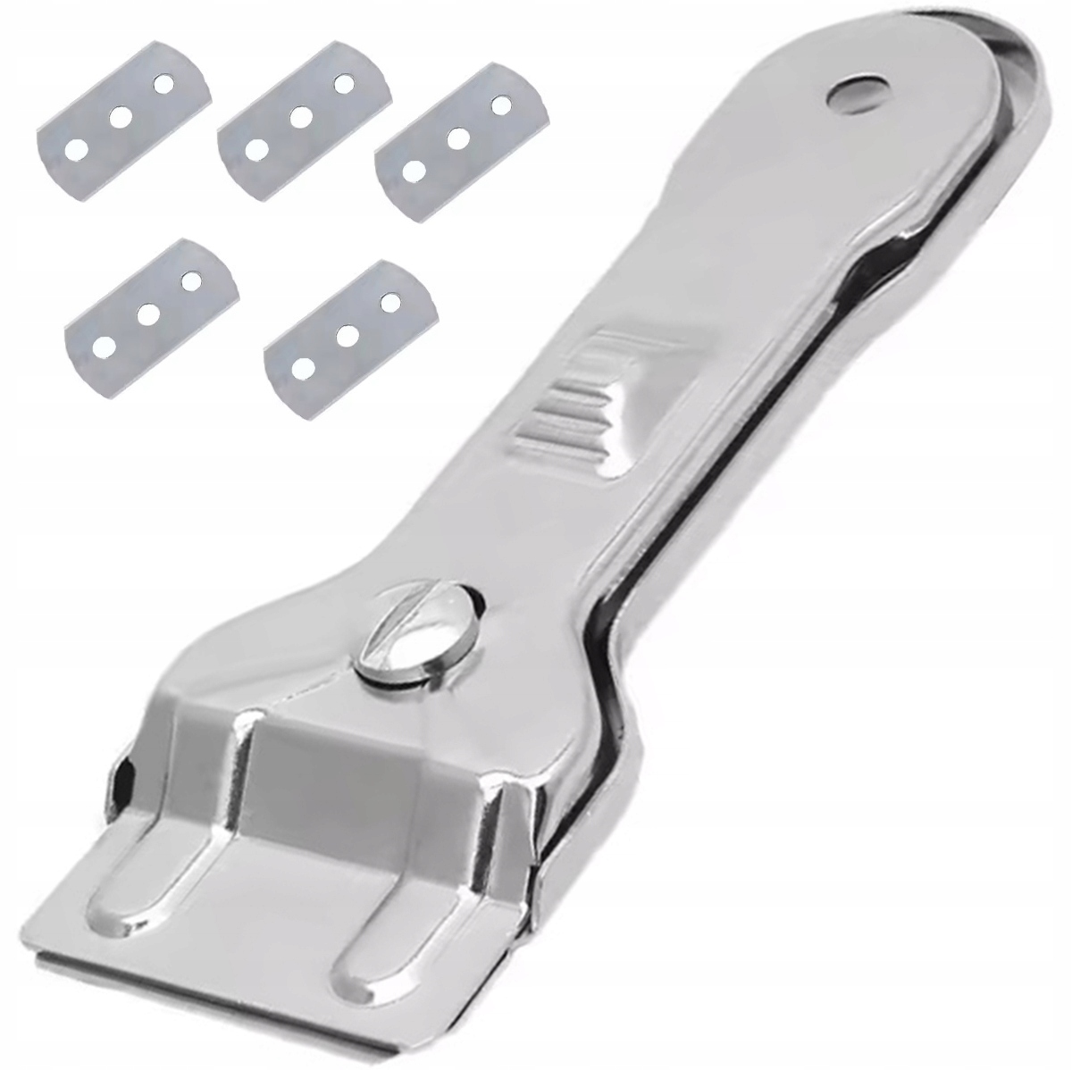 Универсальный стальной скребок для керамических, индукционных плит и стекла. Стальное лезвие позволяет быстро удалить стойкие загрязнения с поверхности тарелки или стекла. Удобная ручка правильной формы обеспечивает надежный хват. Изделие оснащено дополнительным отверстием для подвешивания инструмента. В комплект входят 5 дополнительных сменных лезвий.