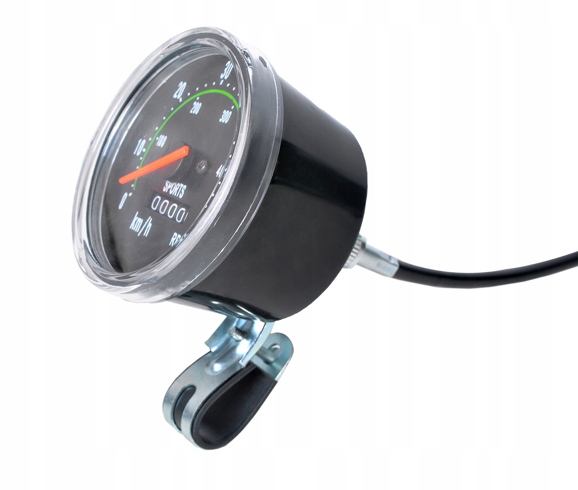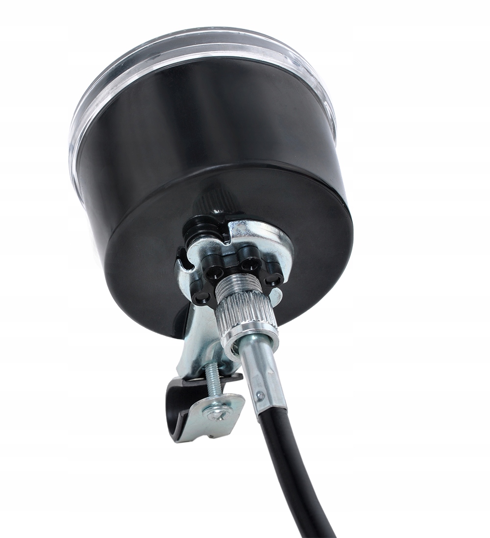 Измеритель приводится в движение кабелем, обычно называемой улиткой, который подключен к переднему хабу сразу за вилкой - амортизатор. Кончик улитки обойден спицами, когда колесо поворачивает передачу улитки, он начинает вращать кабель и запускает механизм. p показывает скорость до 60 км/ч и общее количество пройденных километров. Из -за того, что наконечник движется слева направо, сборка должна проводиться на правой стороне колеса.