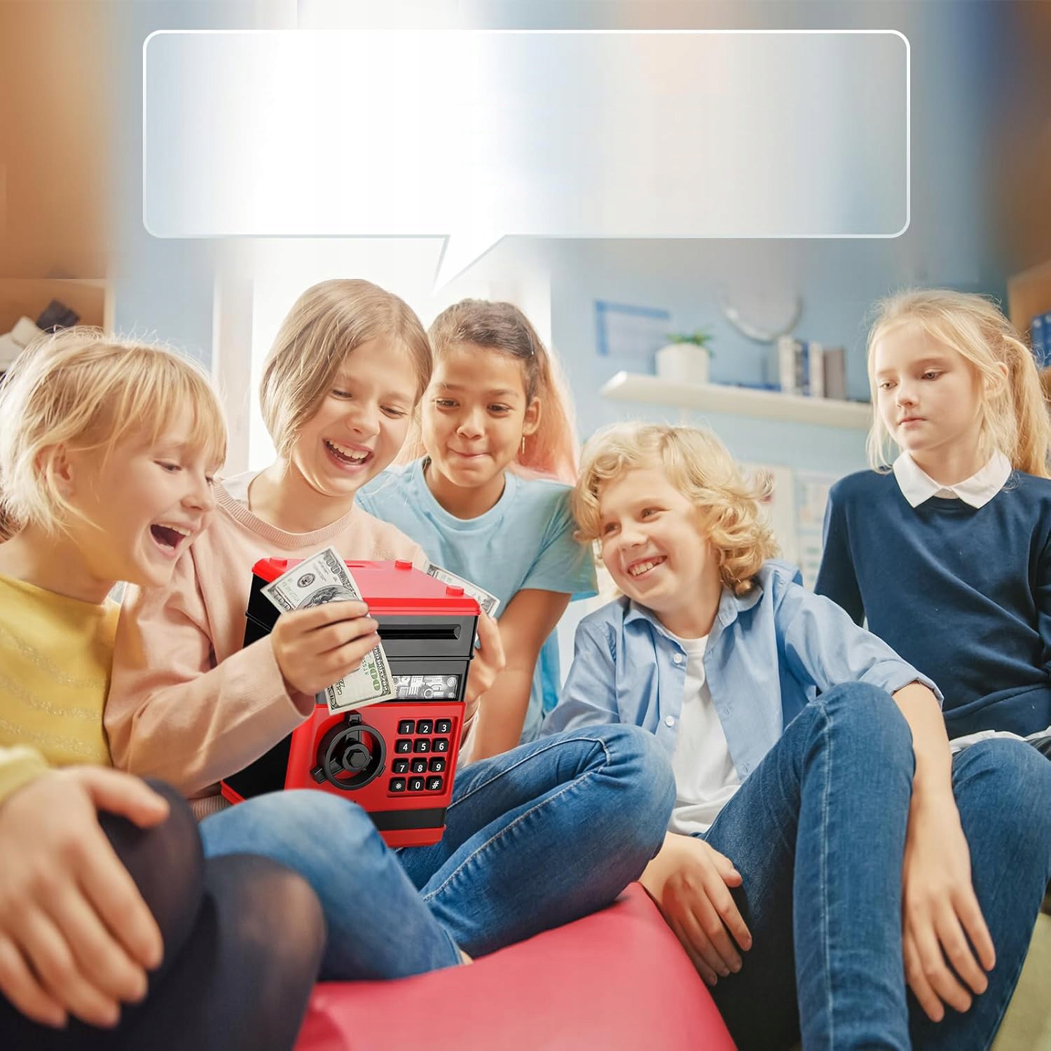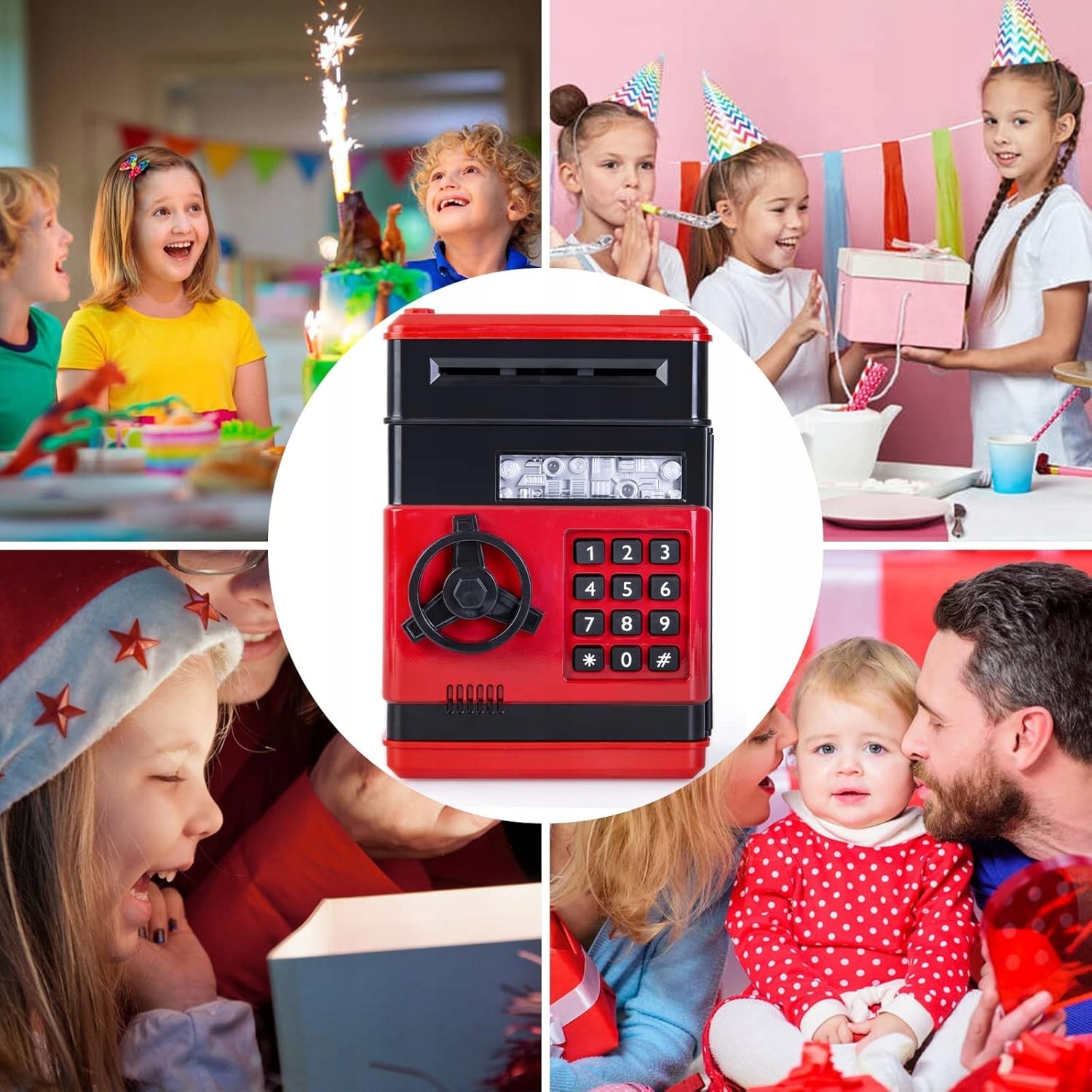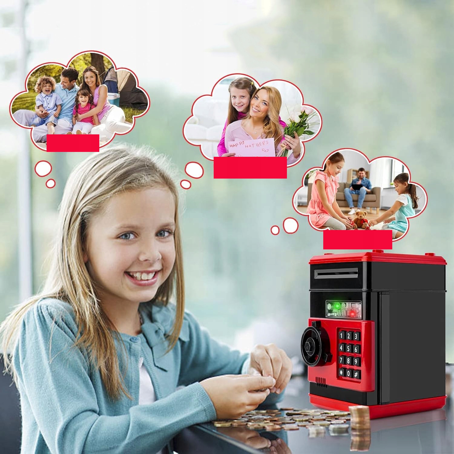 ❤️ Автоматическая перемотка бумажных денег: Вставьте бумажные деньги в прорезь на верхней части детского сейфа, их можно автоматически скатывать в копилку банкомата, а не проскальзывать внутрь. Очень удобно в управлении деньгами. (Но это не сработает, если бумага слишком старая или слишком мягкая)