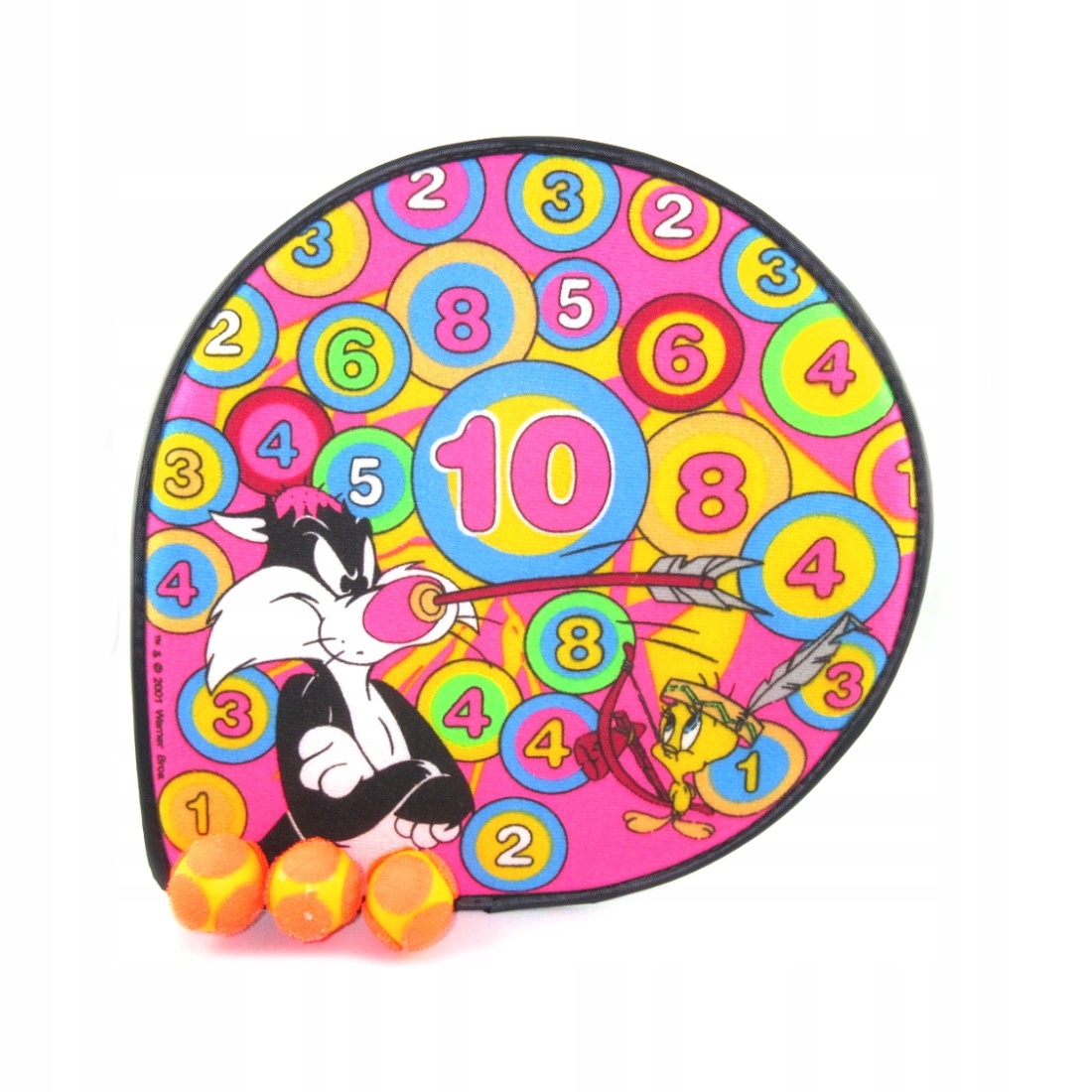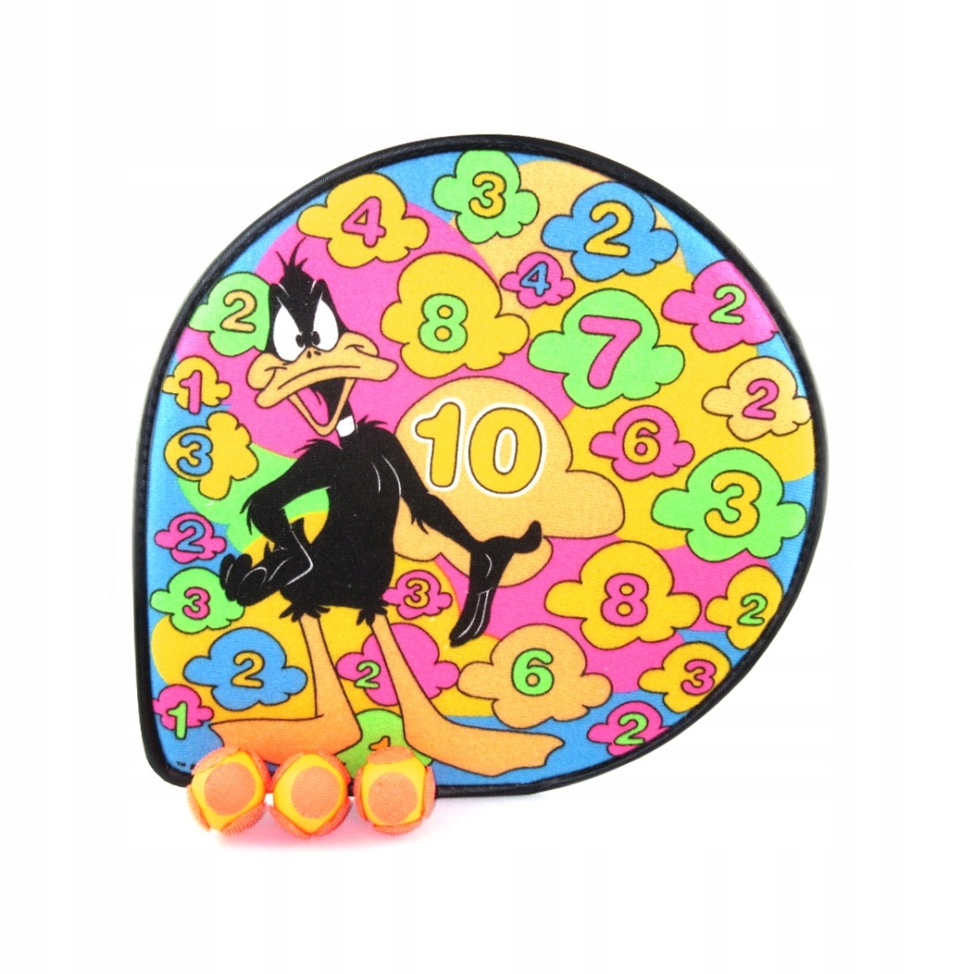 Набор состоит из красочного дартса с пунктирными полями и трех мячей на липучке. Щит имеет крючок для подвешивания куда угодно.