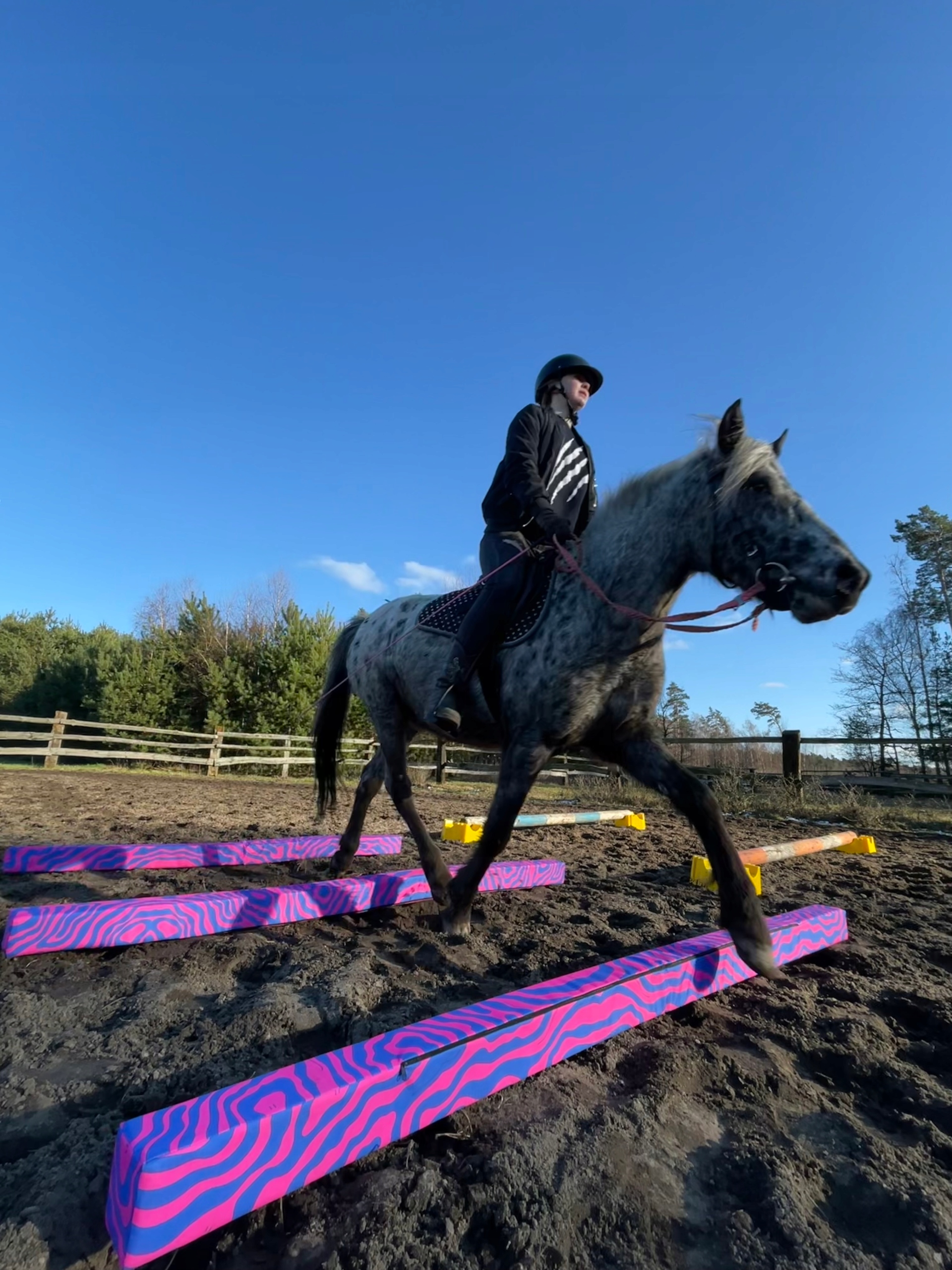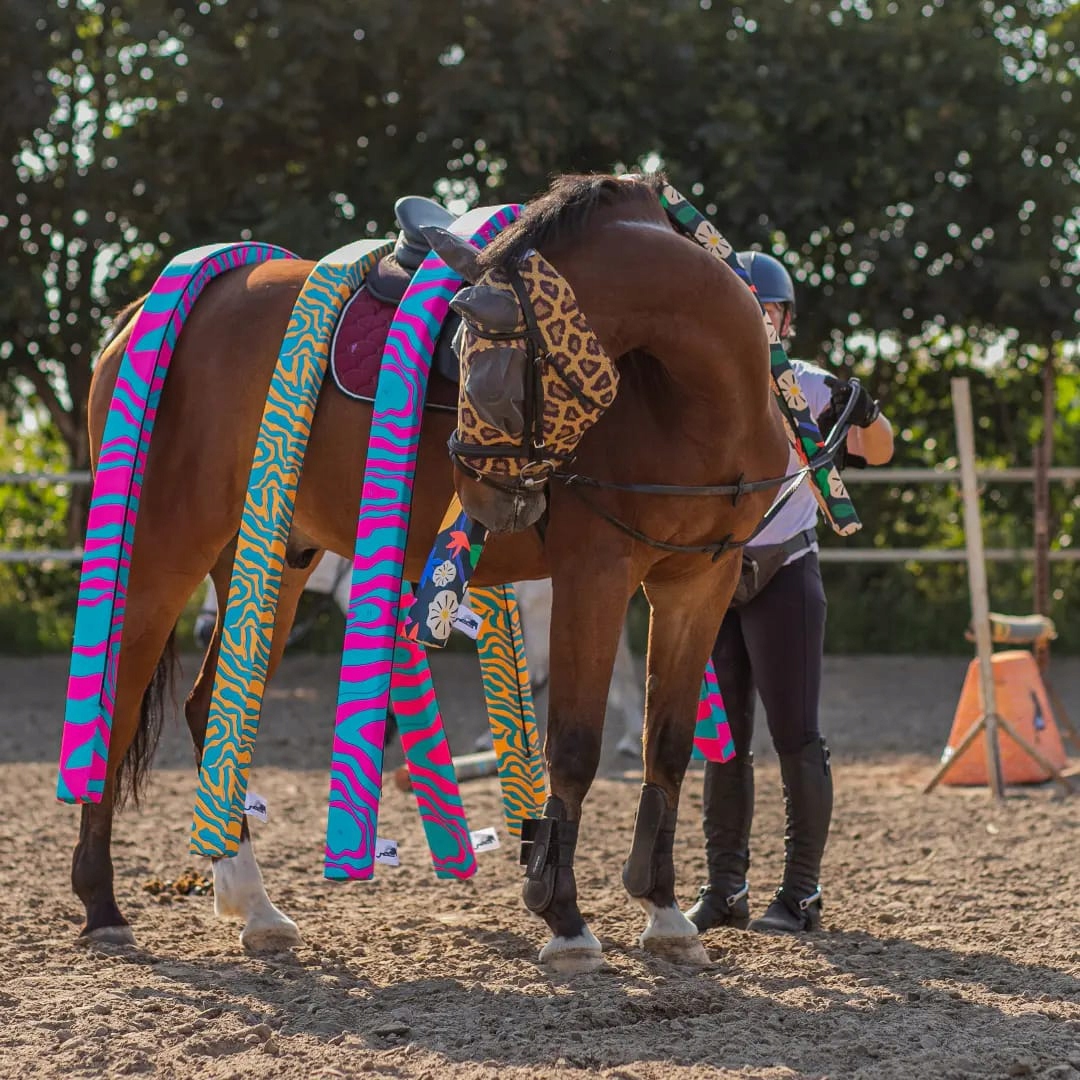 Яркие цвета или узоры на опорах (которые печатаем сами) Они прекрасно задействуют оба полушария мозга лошади, необходимые для выработки правильных движений.