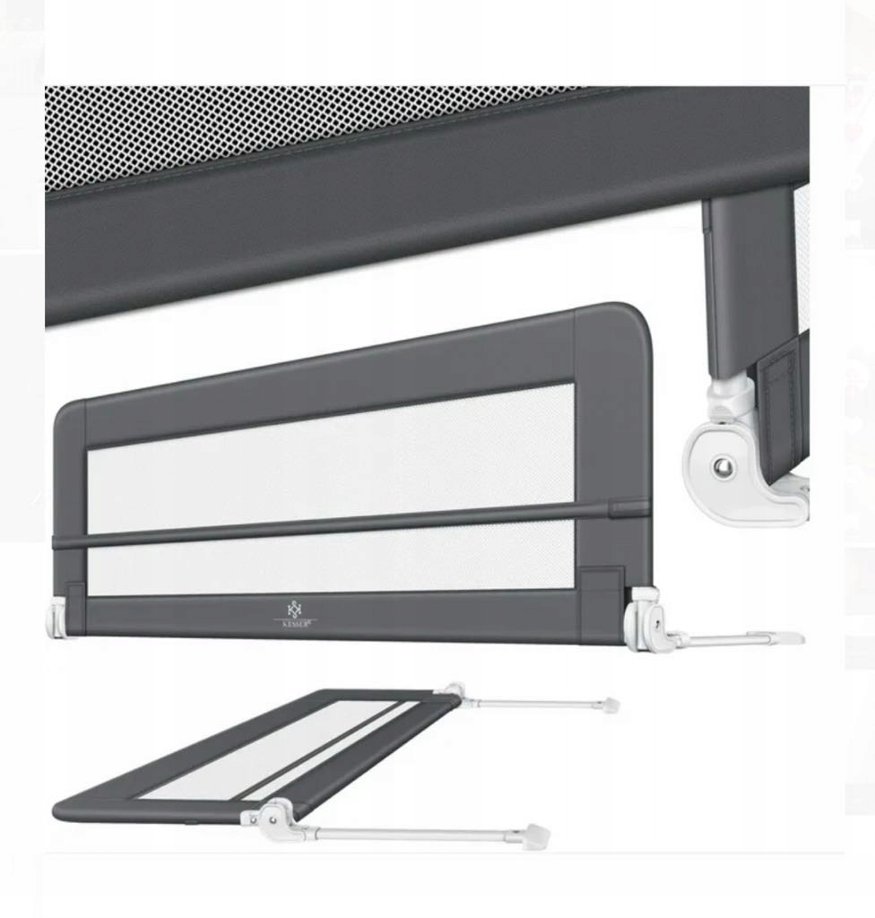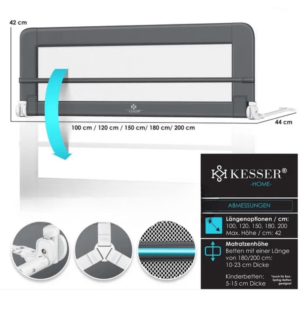 Перила KESSER защищают вашего ребенка во время сна и подходят для большинства стандартных кроватей. Его установка очень проста, а дополнительную защиту обеспечивает ремень безопасности с двумя скобами.