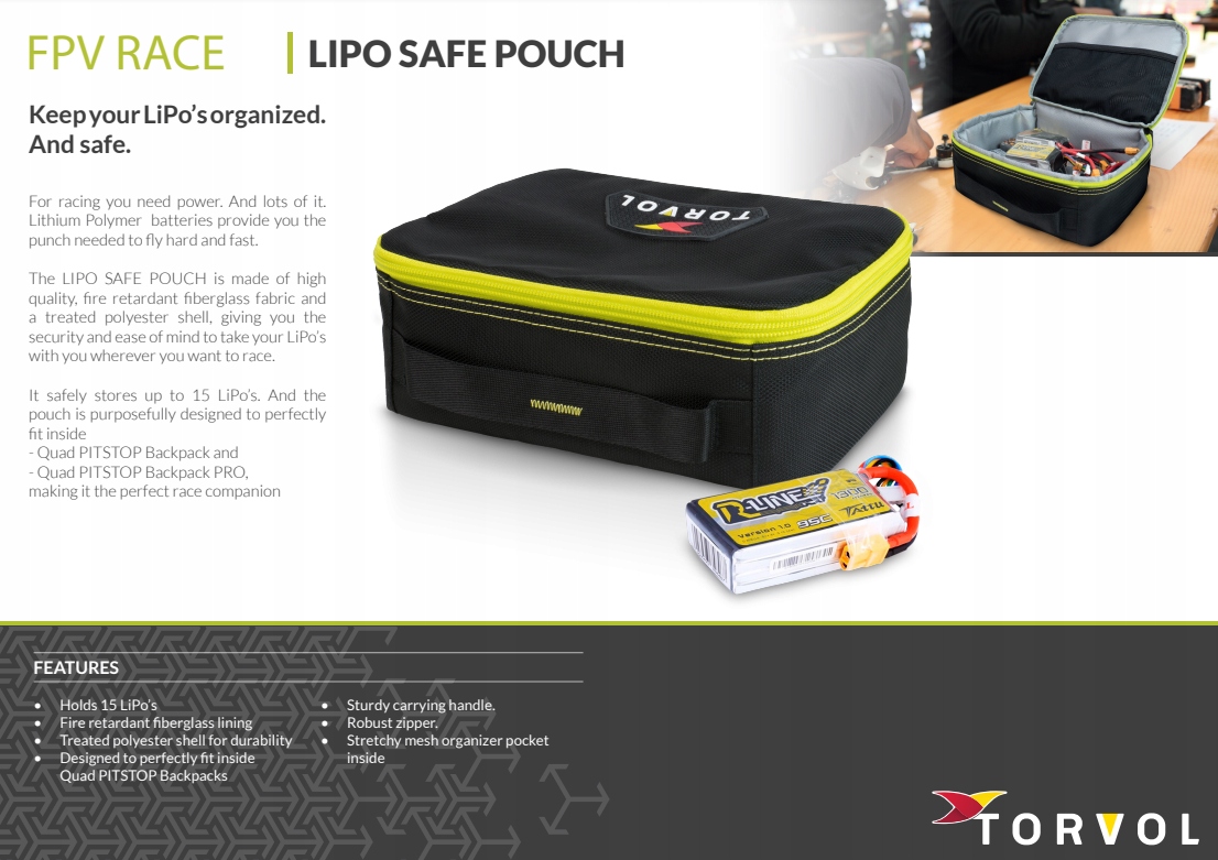 <р> Сумка Torvol LiPo Safe Bag — незаменимый аксессуар для каждого пилота FPV. Обеспечивает безопасное и организованное хранение до 15 LiPo аккумуляторов. Изготовленный из огнестойкой стекловолоконной ткани и прочного полиэстера, он защитит ваше оборудование во время транспортировки. Внутренний сетчатый карман облегчает организацию, а прочная молния и ручка для переноски обеспечивают удобство использования. Идеально подходит для рюкзаков Torvol Quad Pitstop и Quad Pitstop PRO. Особенности продукта:✅ Вмещает до 15 LiPo-батарей