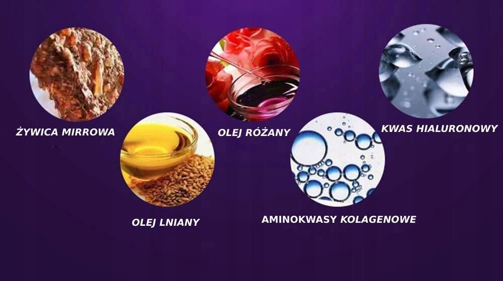 Основные ингредиенты : зерновая смола, розовая масла, гиалуроновая кислота, линяное масло, коллагеновые аминокислоты, Пеларгониевые тарелки, роза Ругоза, Фоникулум. Vulgare
