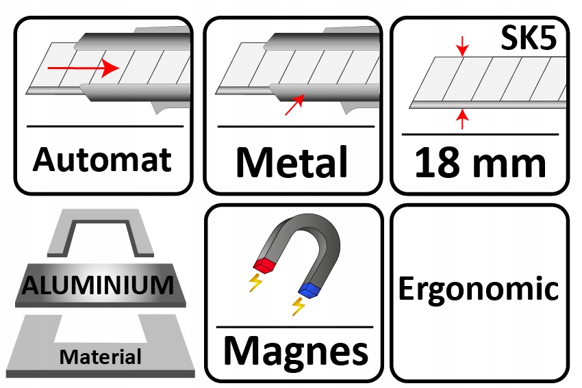 Он имеет систему, которая позволяет выдвигать нож на 15 мм, постоянно удерживая кнопку. Когда вы отпускаете кнопку, нож прячется. Изготовлен из легкого алюминиевого корпуса, покрытого противоскользящей резиной. Эргономичная форма облегчает работу, а слайдер из прочного материала обеспечивает надежность использования. Клинок изготовлен из высокоуглеродистой стали СК5, которая является пружинно-инструментальной сталью. Он долговечен, обладает высокой устойчивостью к растрескиванию, разрушению и истиранию. На рукоятке имеется магний, позволяющий подвешивать нож на металлические поверхности.