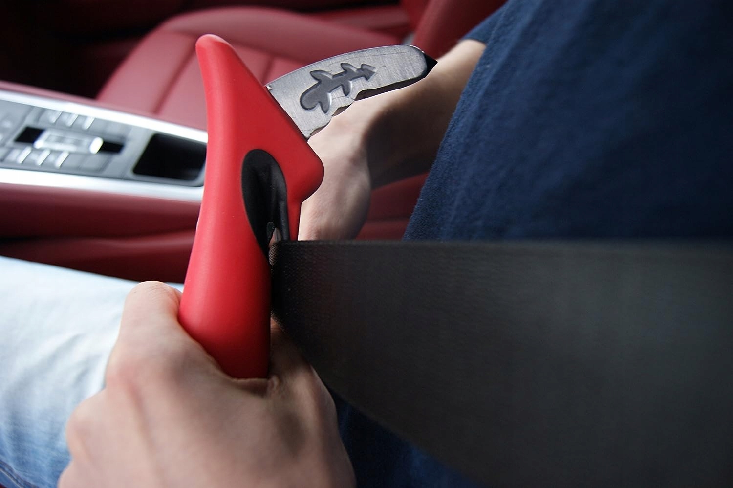 Кроме того, небольшой нож, утопленный для защиты от риска получения травм, можно использовать для перерезания ремня безопасности в случае аварии, а металлический конец можно использовать в качестве спасательного молотка.