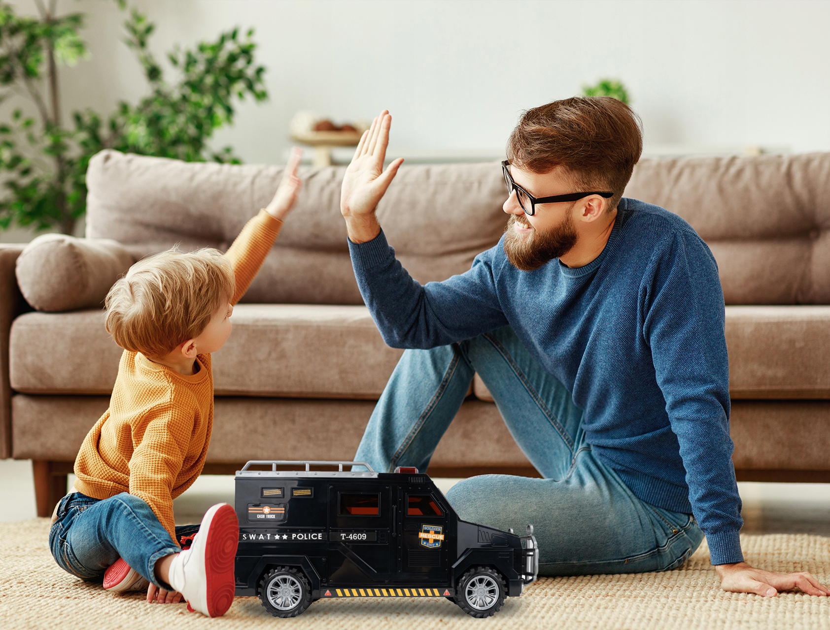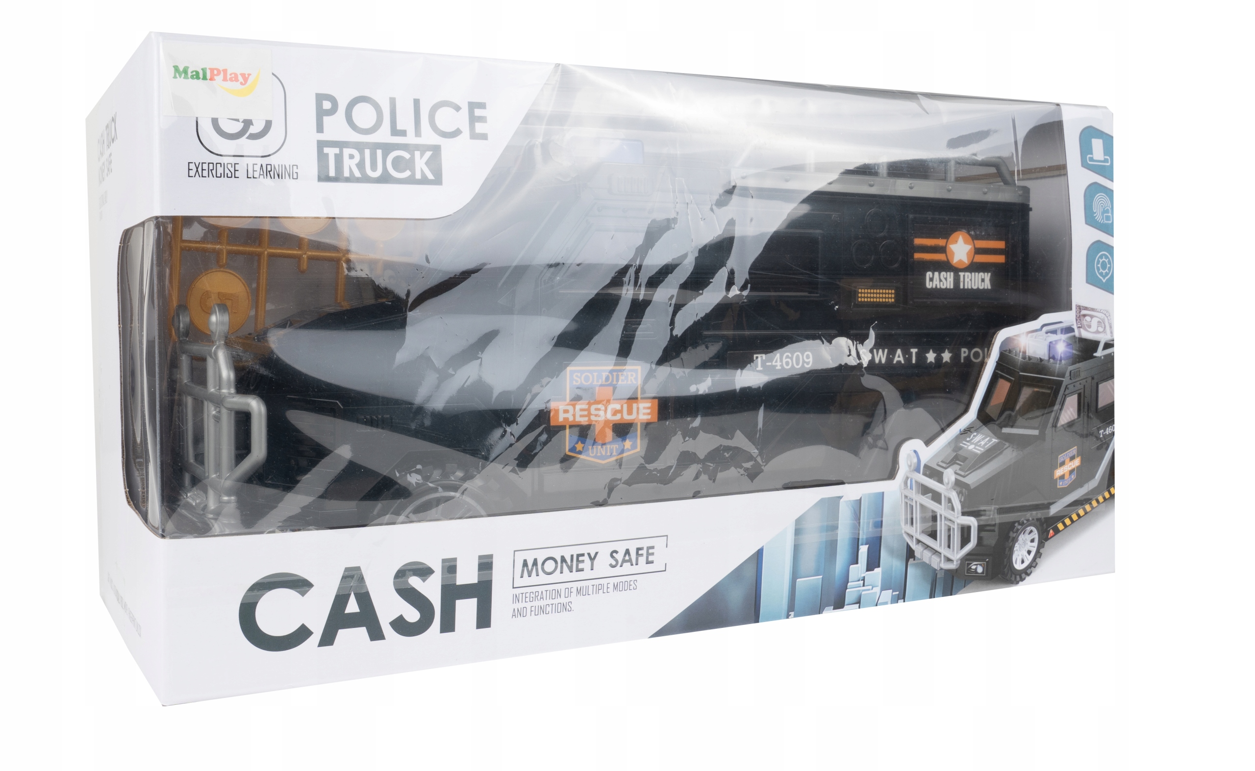 После помещения купюры в копилку машинка начинает играть и мигать синими огнями.