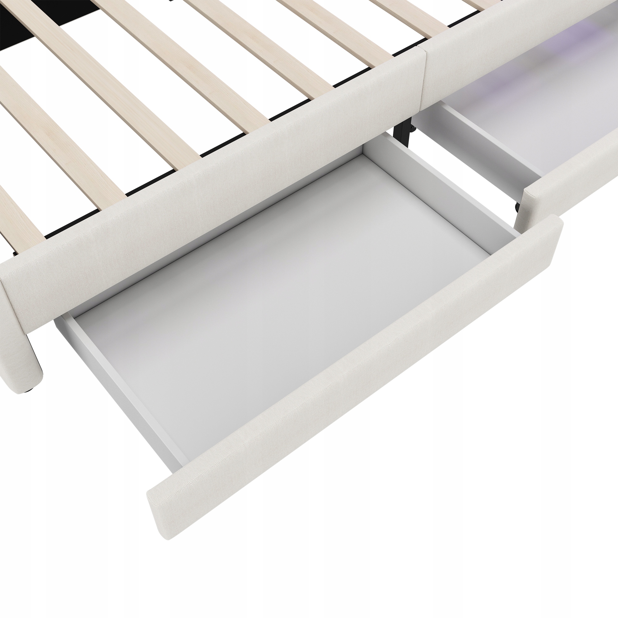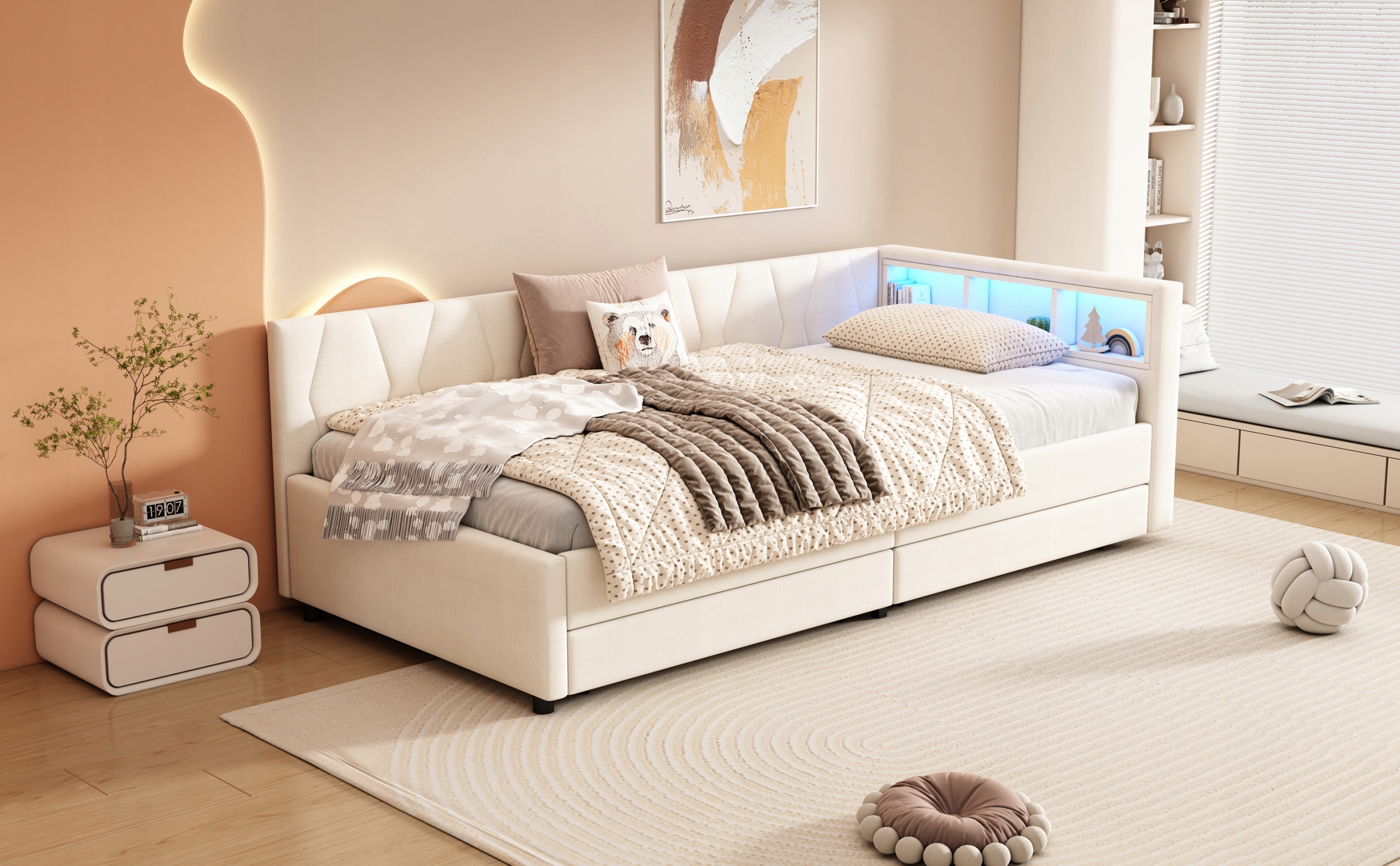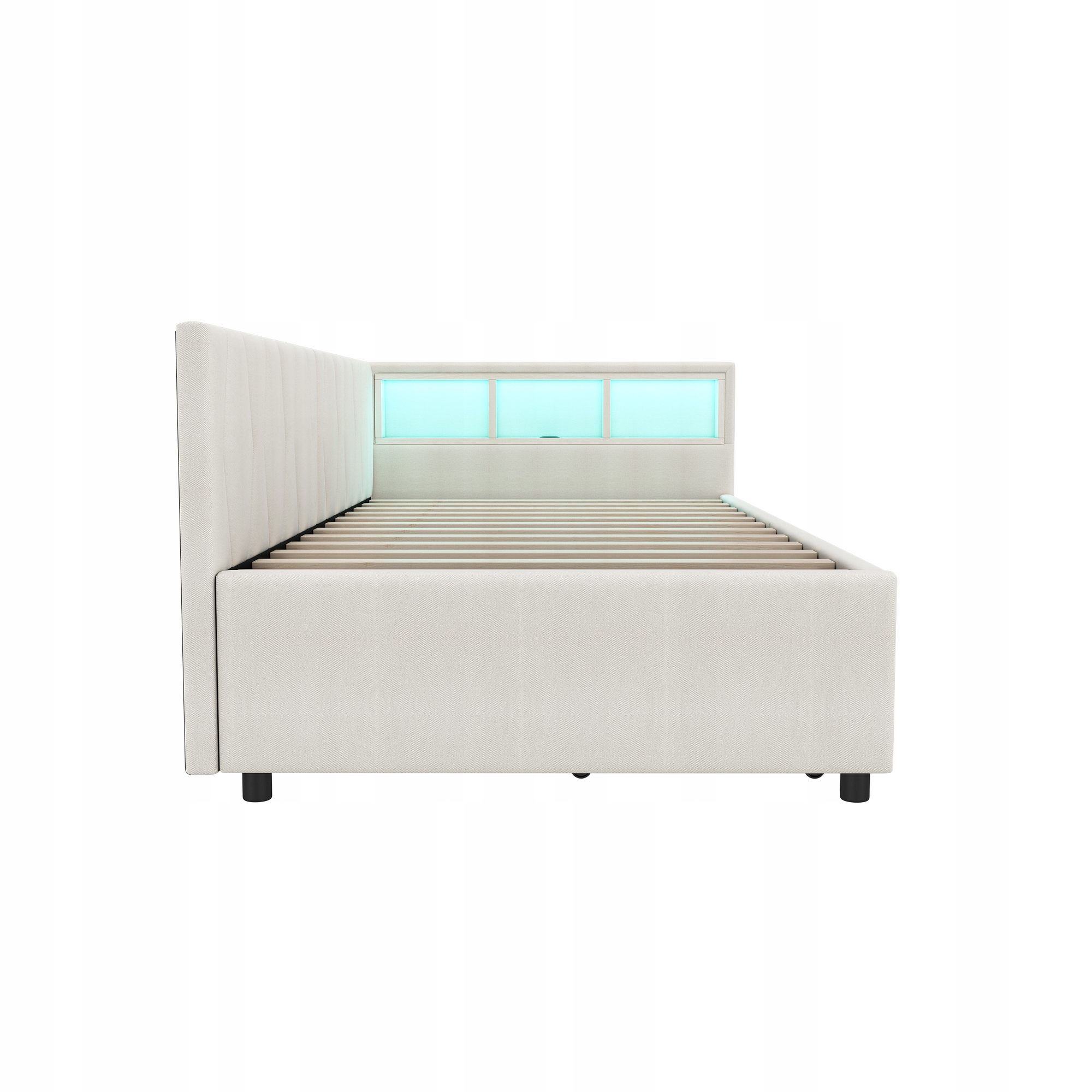 Кушетка, 90*200см, кушетка, диван-кровать, прикроватное отделение, USB+Type C, светодиодная лента, кровать с двумя ящиками, реечная кровать (без матраса), постельное белье, бежевый