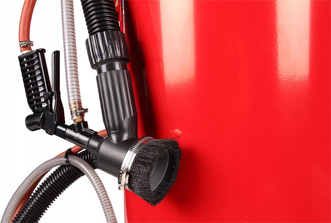 Оснащен пескоструйным пистолетом и встроенным пылесосом мощностью 1200 Вт, который всасывает отбрасываемый под давлением абразив, обеспечивая работу без пыли. Встроенный специальный качественный фильтр позволяет повторно использовать абразив, что позволяет существенно сэкономить при пескоструйной очистке.