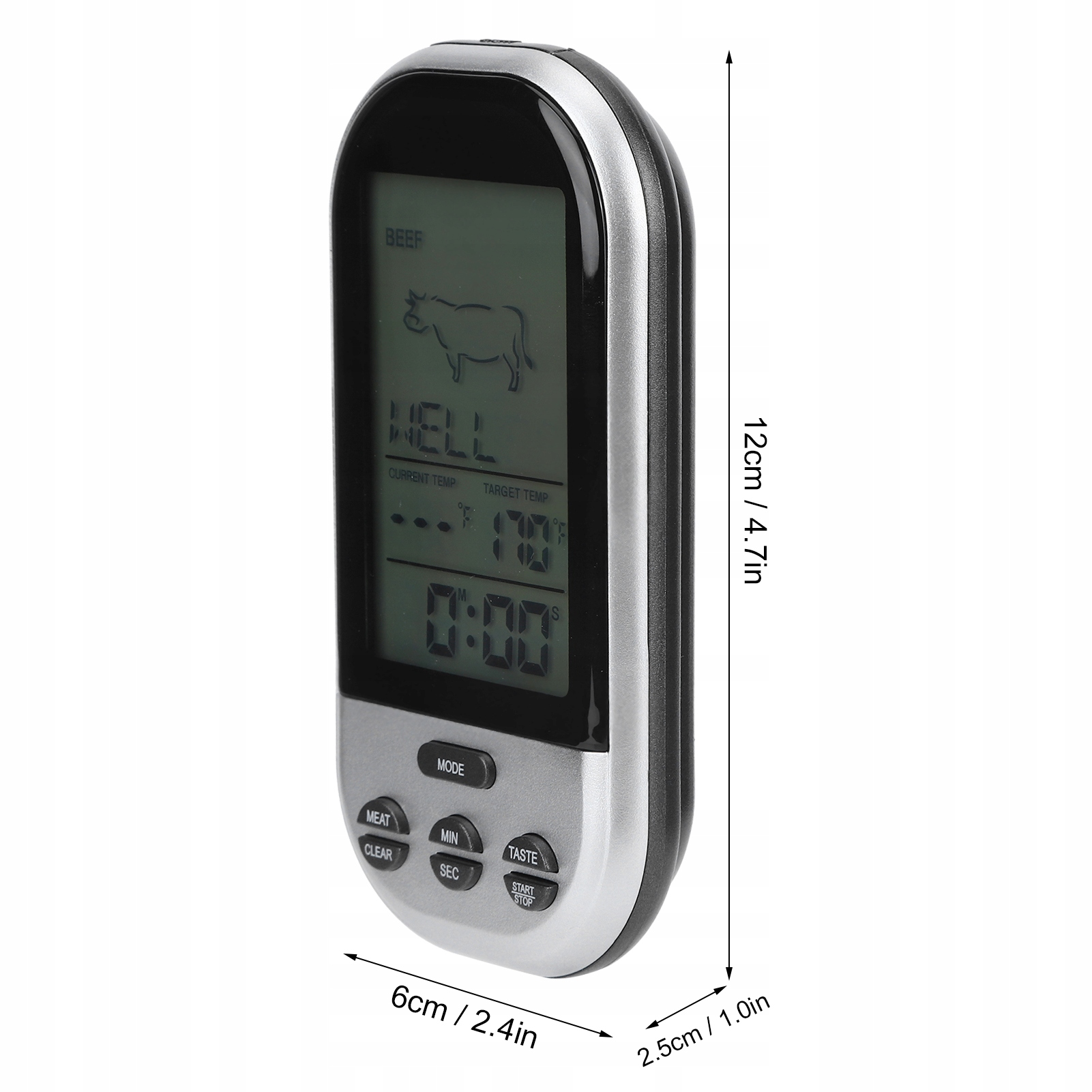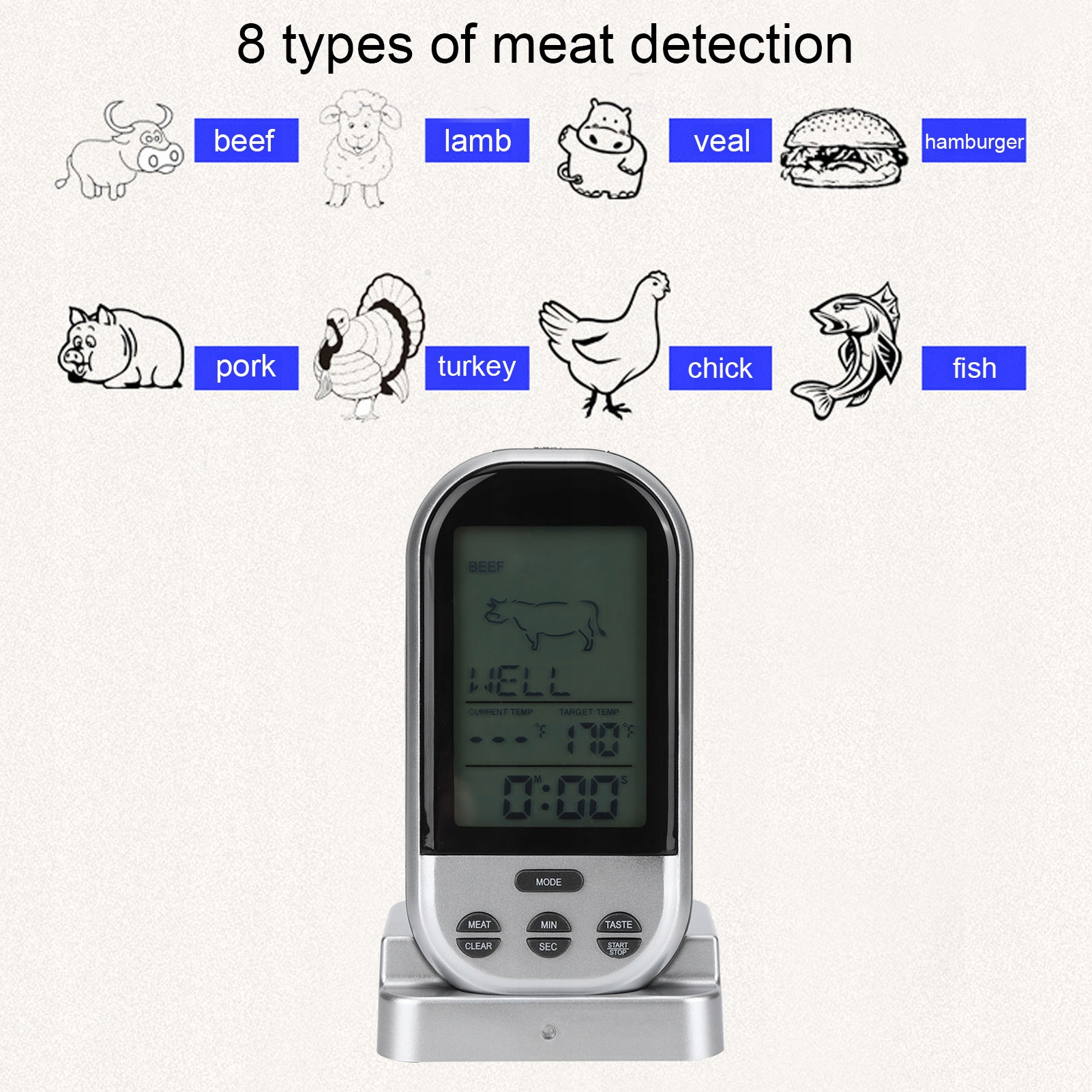 <р>1. В термометре для барбекю предварительно установлены температуры для типов мяса (говядина, баранина, телятина, гамбургер, свинина, индейка, курица, рыба) и их основных сортов (редкое, среднепрожаренное, среднее, среднее, среднее, хорошее).< /п> <р>2. Целевая температура и термометр будут мигать и издавать звуковой сигнал, когда питание подается при заданной температуре. <р>3. Беспроводной пульт дистанционного управления контролирует температуру мяса и гнезда без необходимости постоянно там находиться. <р>4. Простой, удобный и практичный термометр, который поможет приготовить вкусную еду: достаточно вставить щуп в еду. <р>5. Термометрия мяса для гриля, приготовления кухонной еды, гриля, духовки, коптильни.Спецификация: