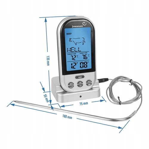 Беспроводной электронный пищевой термометр – безусловно, незаменимый помощник на каждой кухне, а также на даче или в саду. Он идеально подходит для варки, гриля, запекания, жарки, копчения, а также для приготовления пюре и перегонки. Прибор имеет заранее запрограммированные функции измерения температуры различных видов мяса и видов приготавливаемых блюд, что значительно облегчит вашу работу на кухне – особенно в начале вашего кулинарного приключения! Дополнительным преимуществом является возможность установить «собственную» температуру, например, температуру конца перегонки или ферментативного перерыва – тогда термометр сообщит вам звуковым сигналом, когда она будет достигнута. Термометр имеет ручку, позволяющую прикрепить его к ремню. Будьте профессионалом на своей кухне, контролируйте температуру блюд с помощью беспроводного электронного термометра! Дальность действия 25 метров особенно полезна, когда вы готовите на гриле с друзьями. Благодаря дистанционному контролю температуры вы сможете проводить время среди людей, а не за грилем! Термометр позволяет измерять температуру по двум шкалам: от 0°С до 250°С и от -32°F до 482°F. Диапазон таймера составляет 99 минут 59 секунд.
