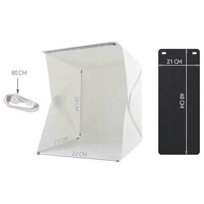 СПЕЦИФИКАЦИЯ - размеры 22/23/28см, кабель 80см, вес комплекта 220г, в комплекте палатка, 2 фона (белый и черный) и кабель microUSB.