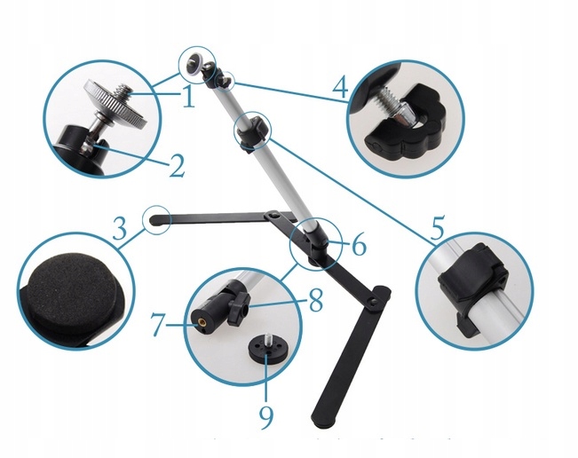 Резьба 1/4 дюйма позволяет установить любую камеру и камеру со стандартным резьбовым соединением. Конструкция позволяет наклонять вал как вперед, так и назад. Все фиксируется привинченной ручкой в нижней части монопода. есть стандартное резьбовое отверстие 1/4 дюйма, позволяющее установить его, например, на штатив большего размера. Высоту штатива можно регулировать от 29 до 45 см.