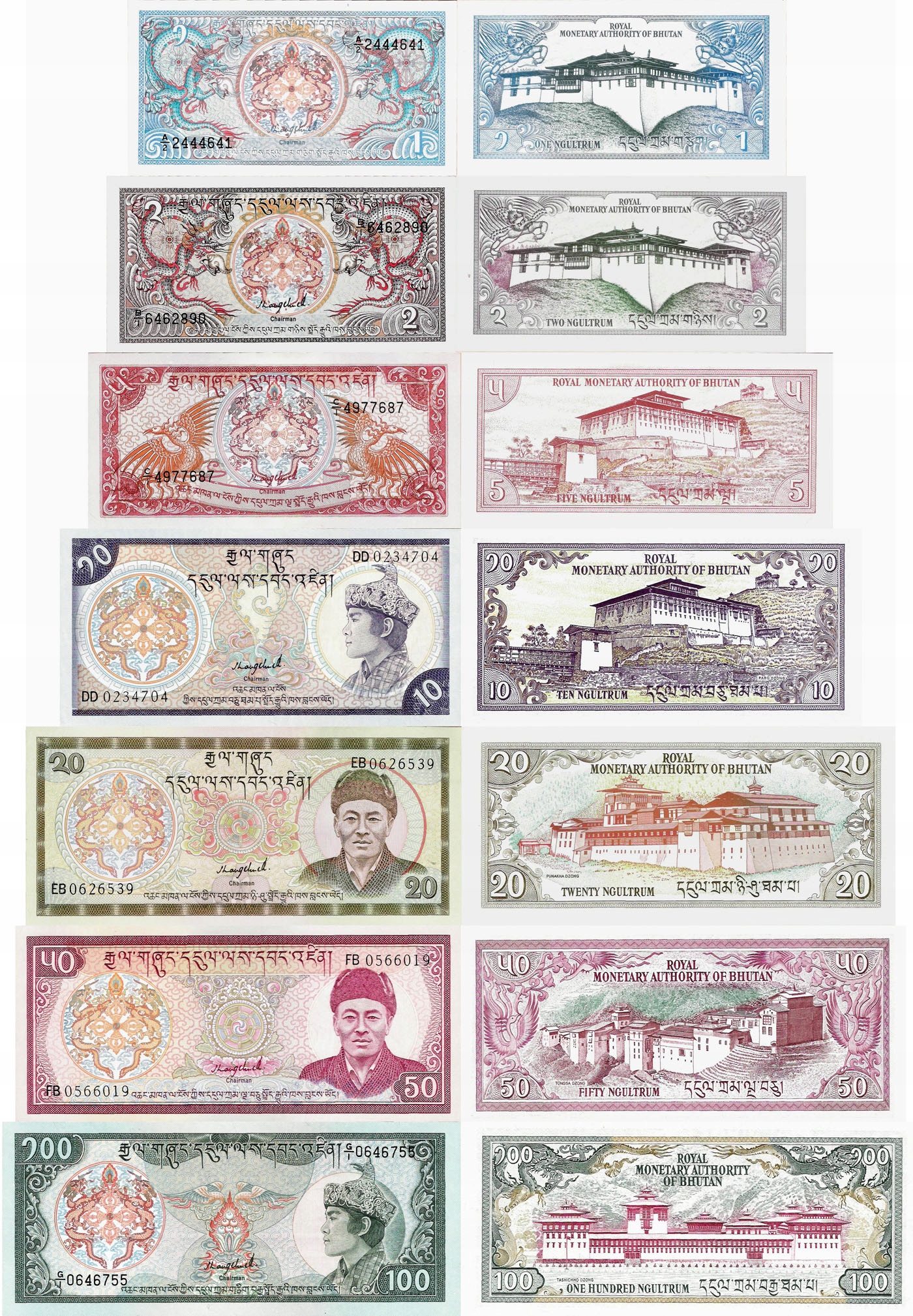 Bhutan ND 1985-92 - zestaw 7 szt 1+2+5+10+20+50+100 Ngultrum Pick 12-18 UNC