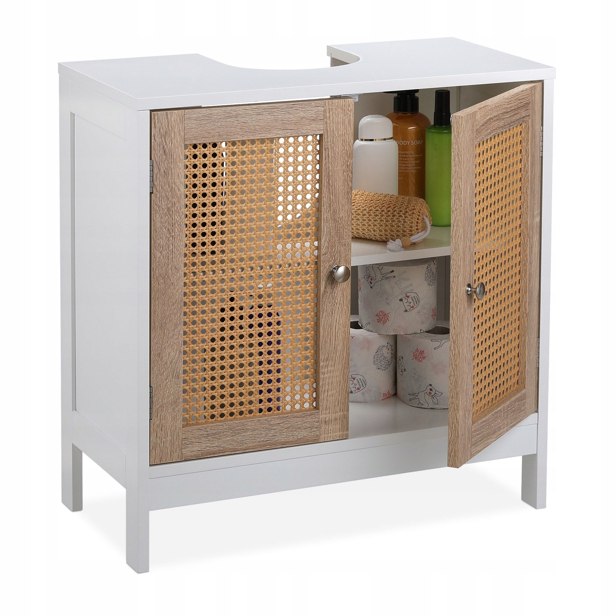 Благодаря практическому постоянному шкафу вы можете оптимально использовать свободное пространство под раковиной. Особенно в небольших ванных комнатах вы можете создать дополнительное, необходимое место для хранения. Интерьер шкафа для ванной комнаты, который можно разделить на 2 камеры, предлагает достаточно места для полотенец, туалетной бумаги, чистящих средств и других аксессуаров для ванной комнаты. Двери ротана придают белому шкафу раковине привлекательный вид, который является декоративным акцентом в каждой ванной комнате.