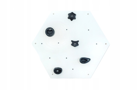 Одна доска для скалолазания с геометрической формой шестиугольника, с 5 ручками контрастного черного цвета. Идеально как независимый модуль или элемент более крупной конструкции.