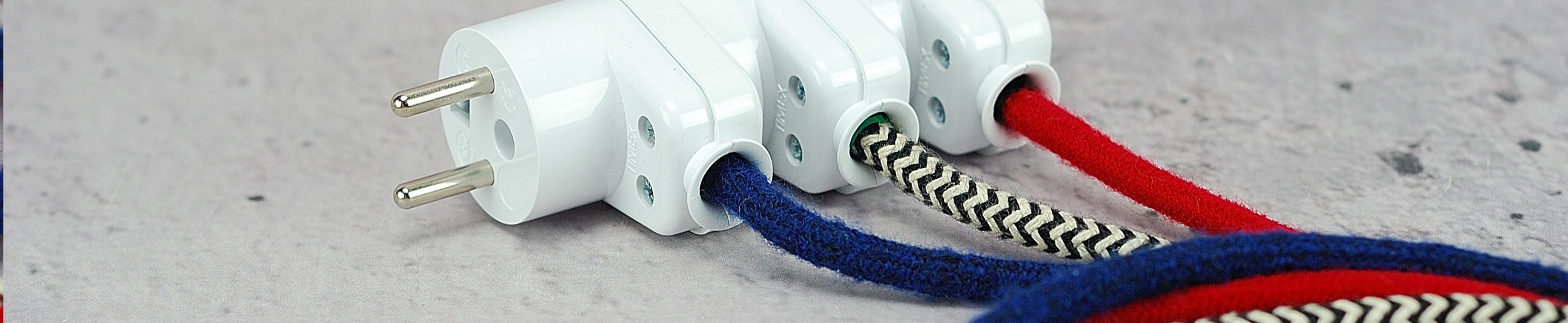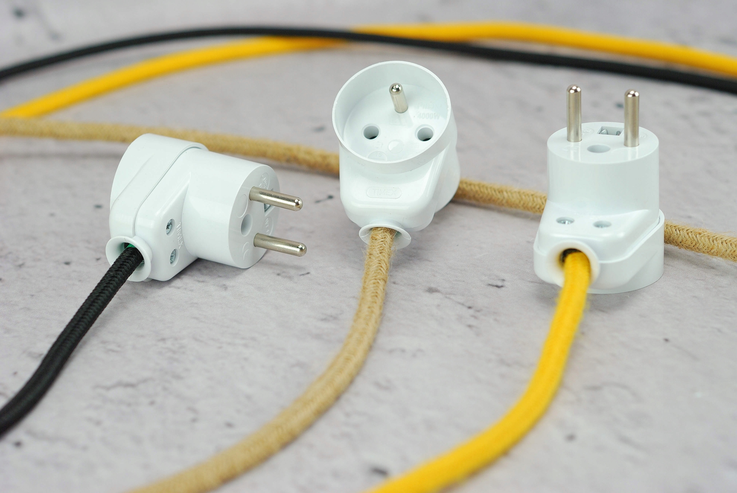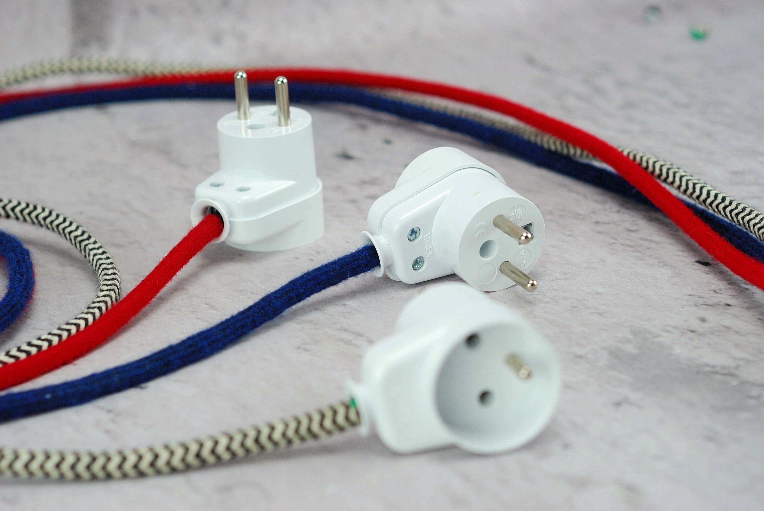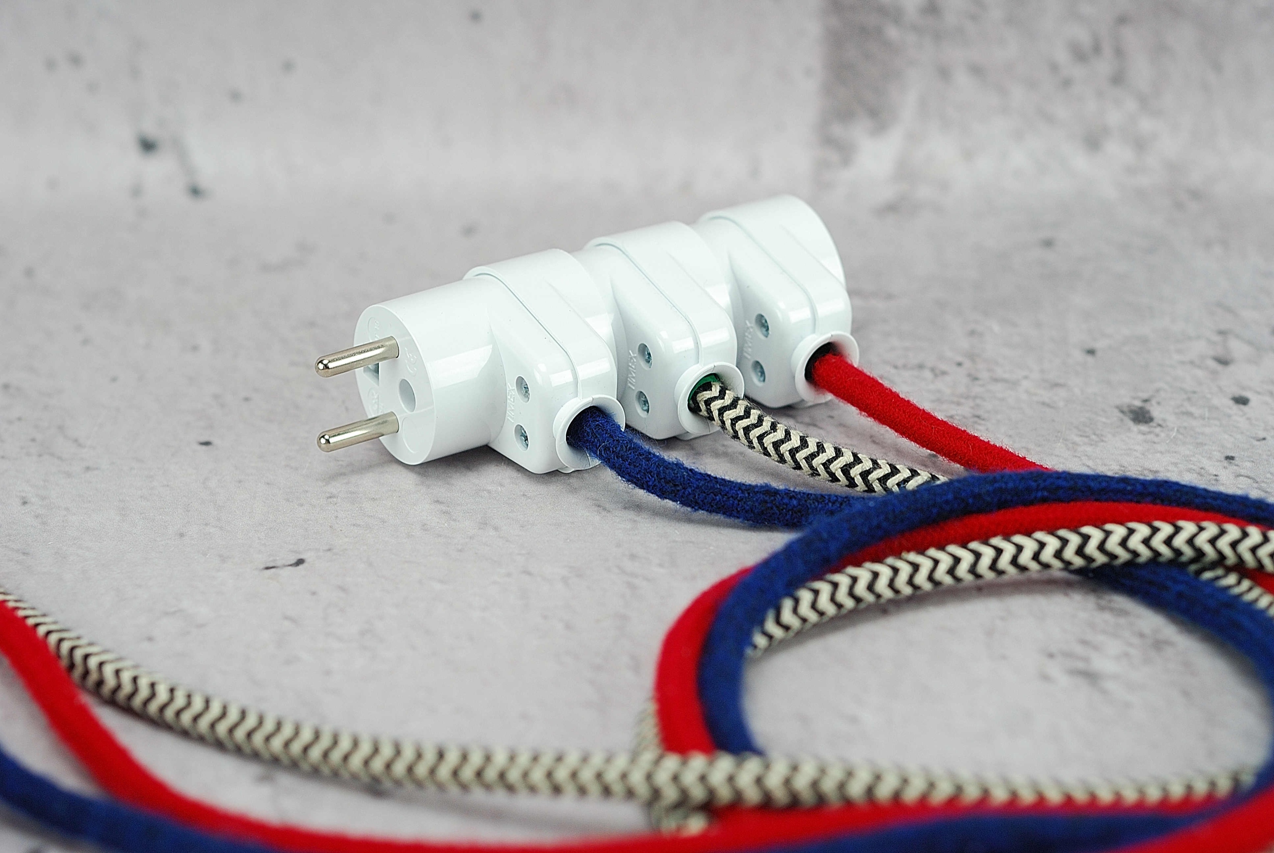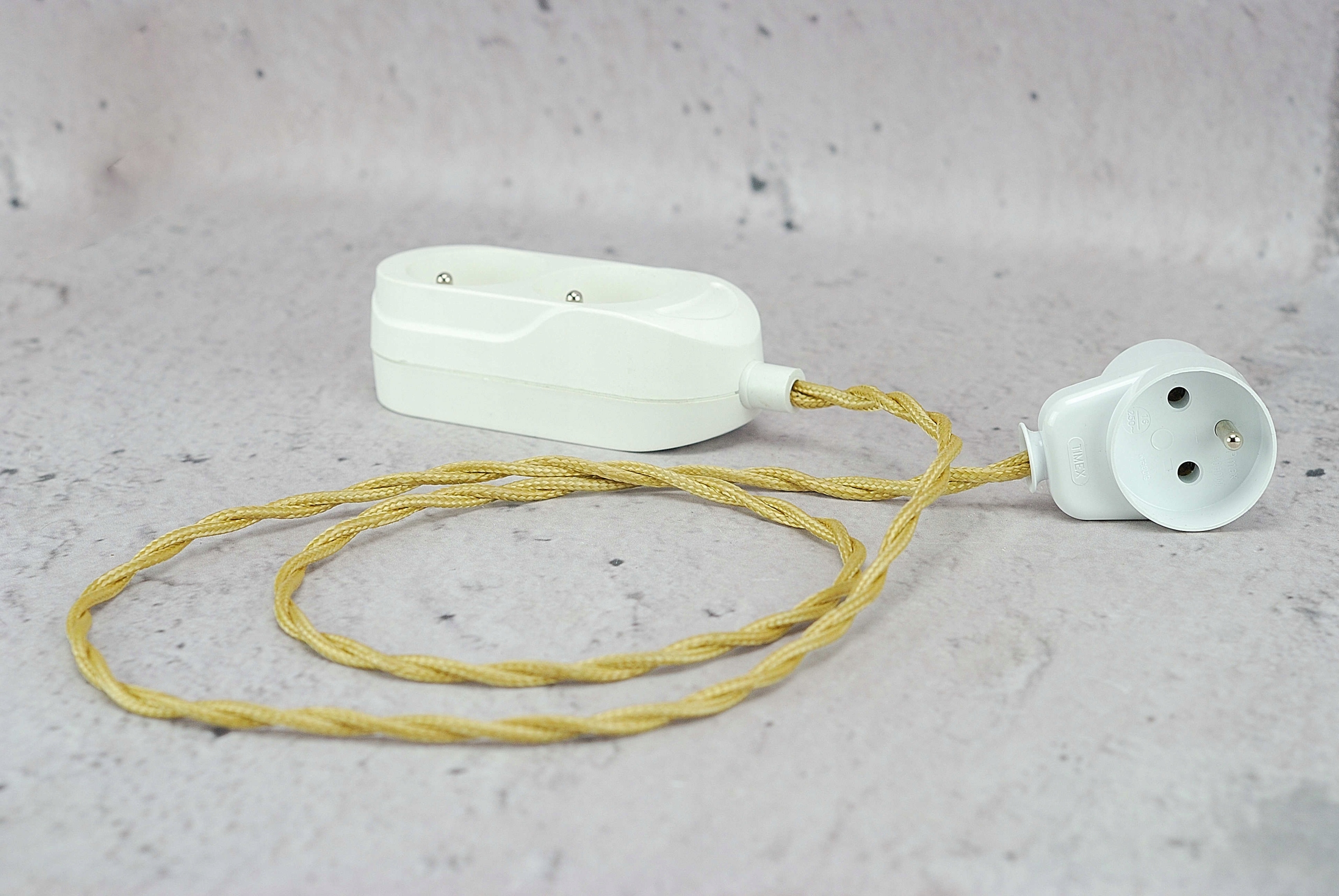 biała wtyczka kątowa z gniazdem przelotowa loftowa loft do kabla w oplocie