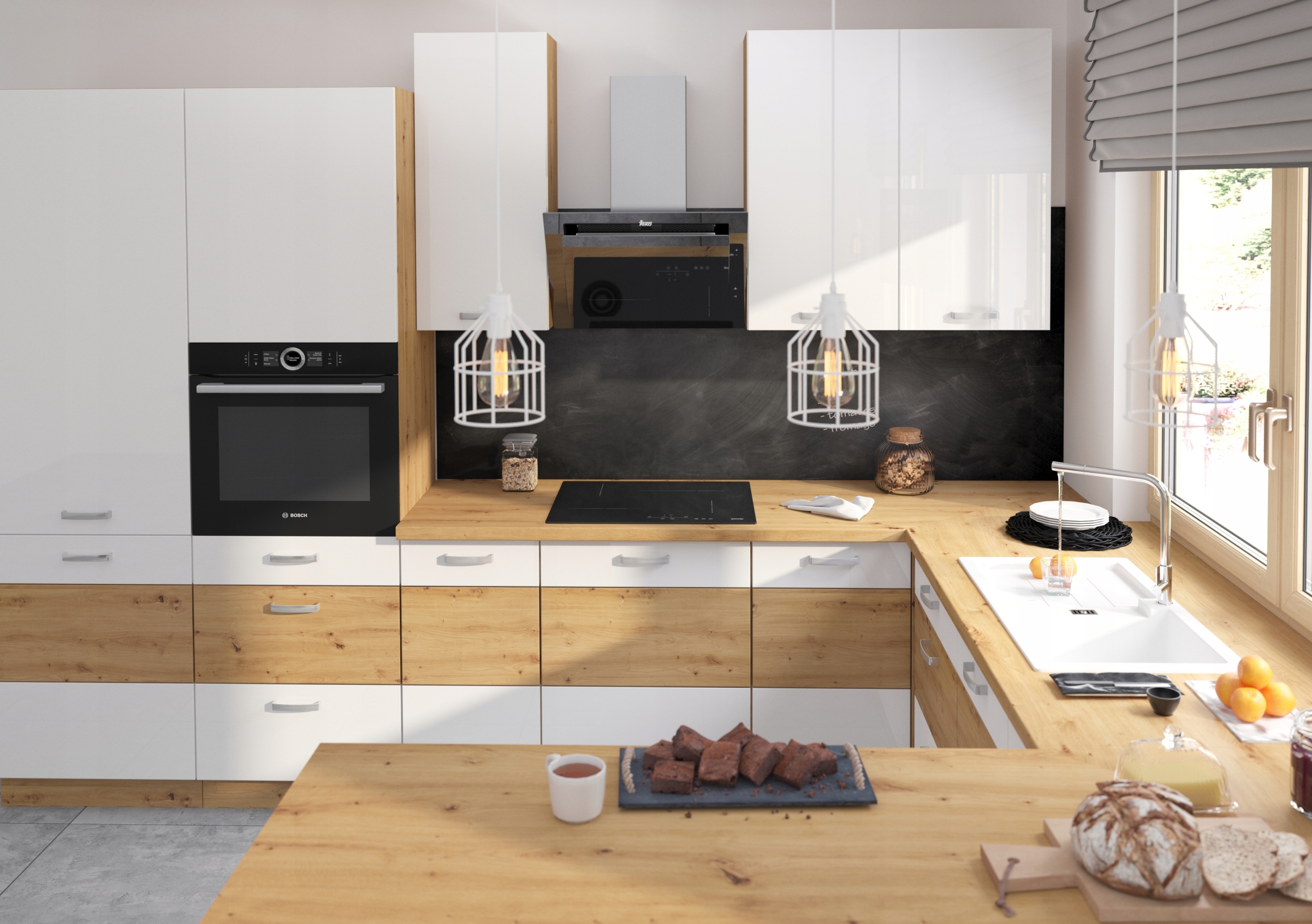- Фронты: mdf 16 -мм белый глянец/ламинированный дуб Artisan - Abs Edge
