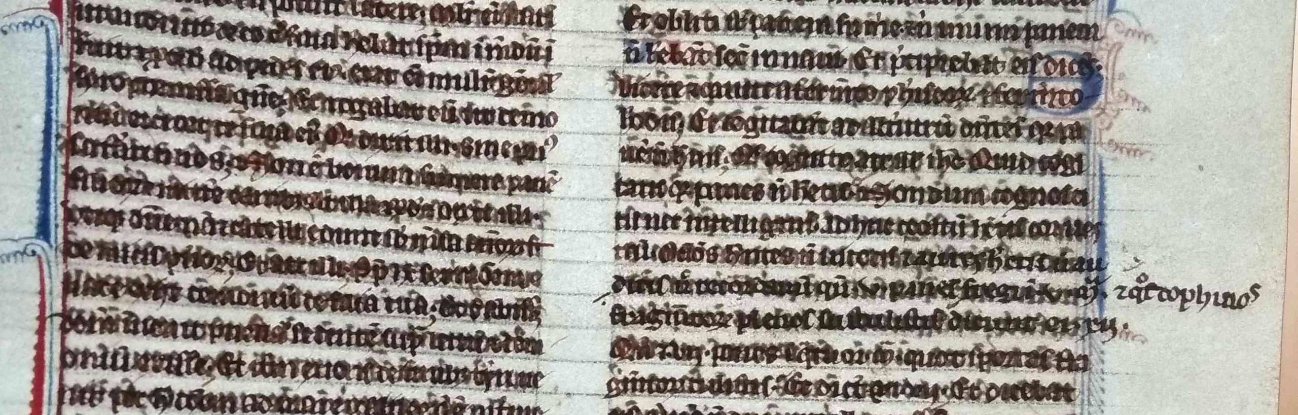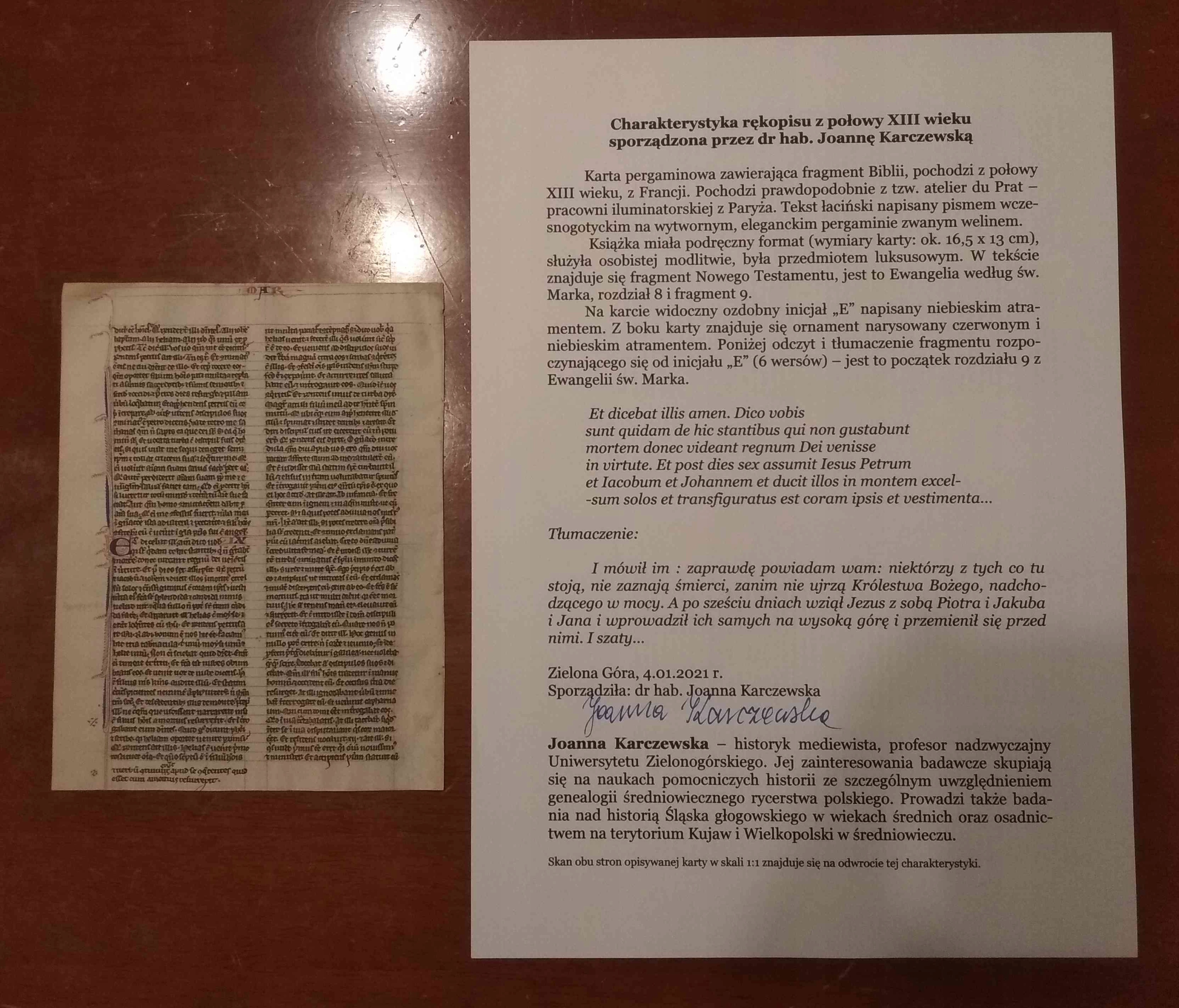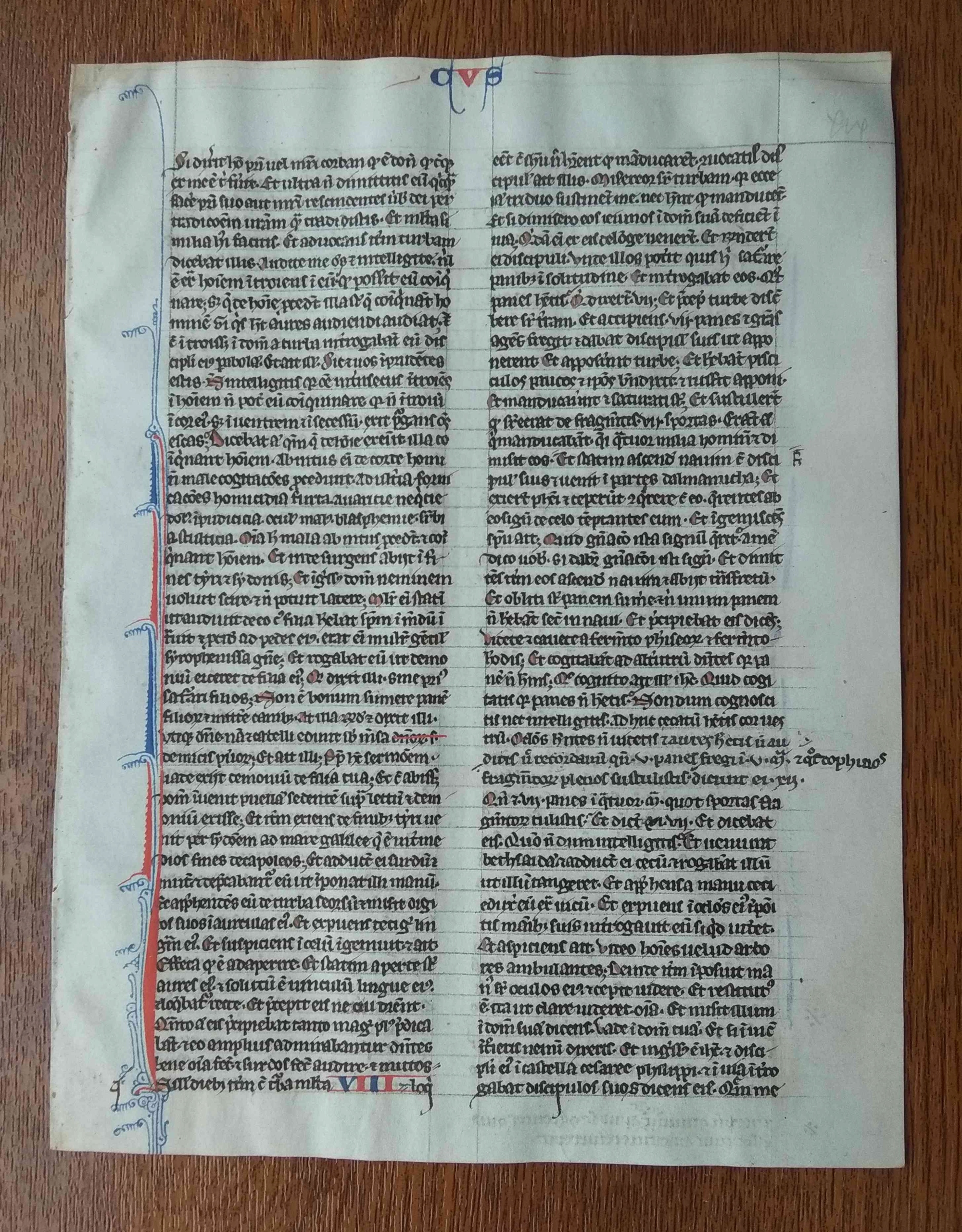 Страница пергамента, содержащая фрагмент Библии, датируется серединой 13 века, из Франции. Вероятно, это происходит от так называемого atelier du Prat – студия освещения из Парижа. Латинский текст, написанный раннеготическим шрифтом на изысканном, элегантном пергаменте, называемом пергаментом.