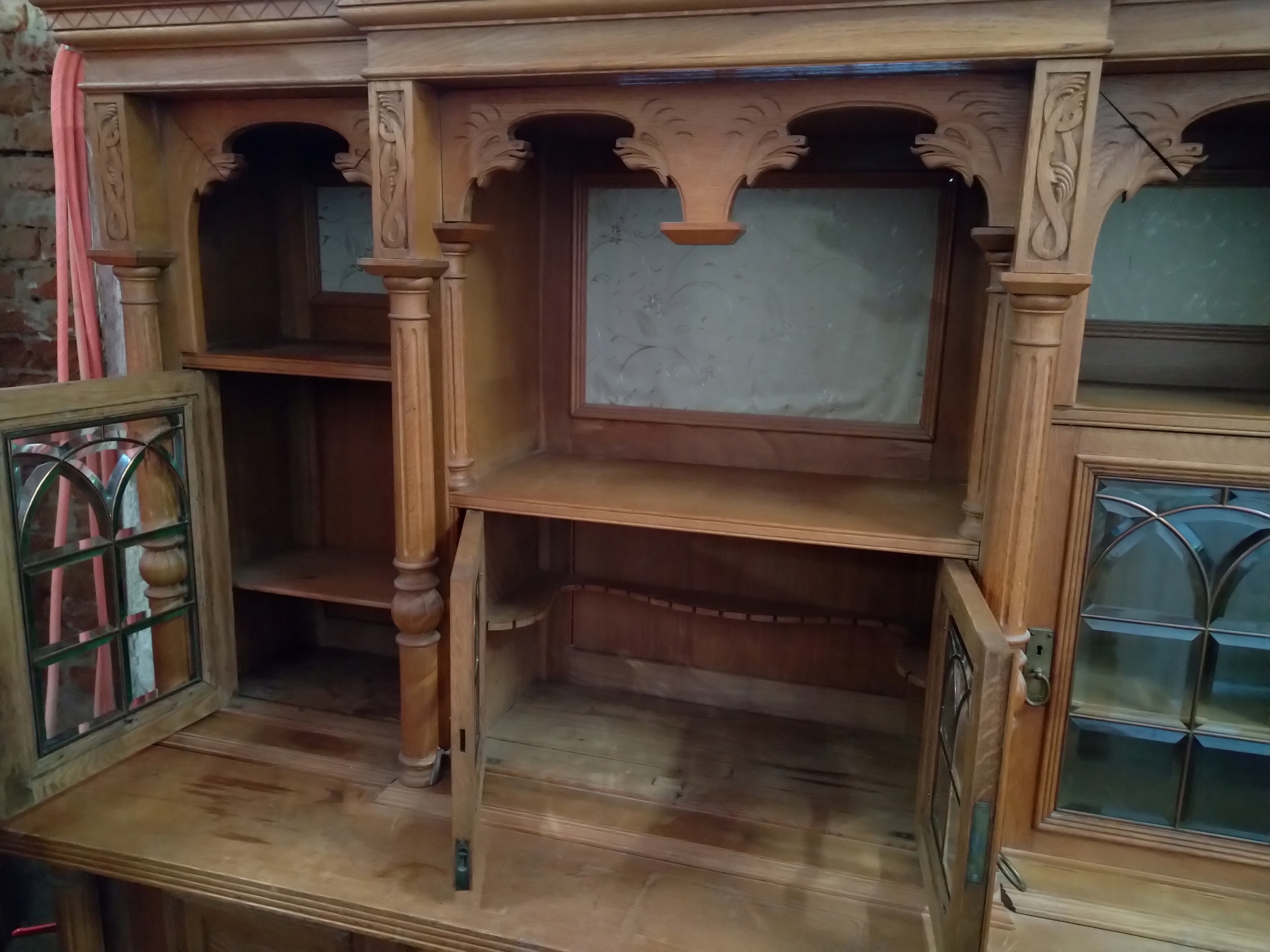 Эклектичный дубовый сервант конца 19 века, служивший библиотекой, хорошее состояние, некоторые мелкие куски планок отсутствуют и запылились, хрустальный витраж, дубовая масса, возможность недорогой ремонт за дополнительную плату.Обратите внимание, что мебель разделена только на два элемента, перед покупкой убедитесь, что мебель можно занести в помещение. Размеры элементов 177 х 90 х 62 и 177 х 110 х 40.