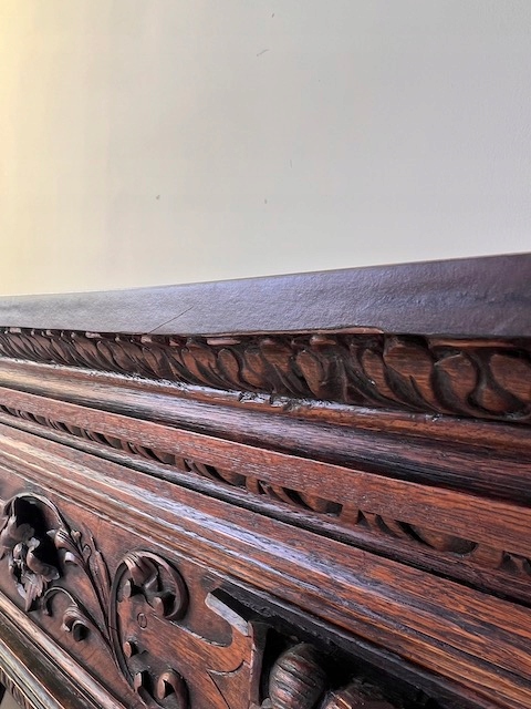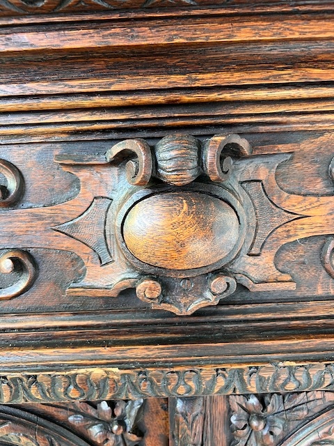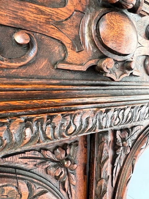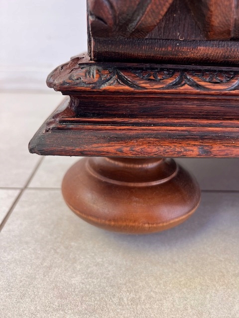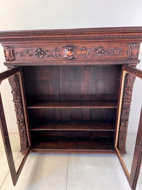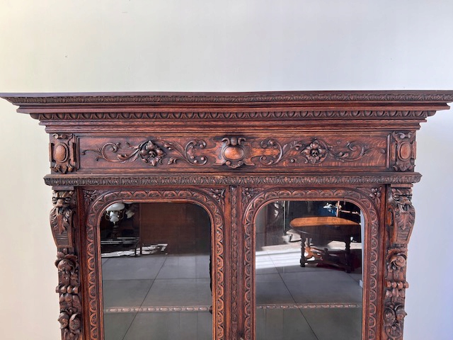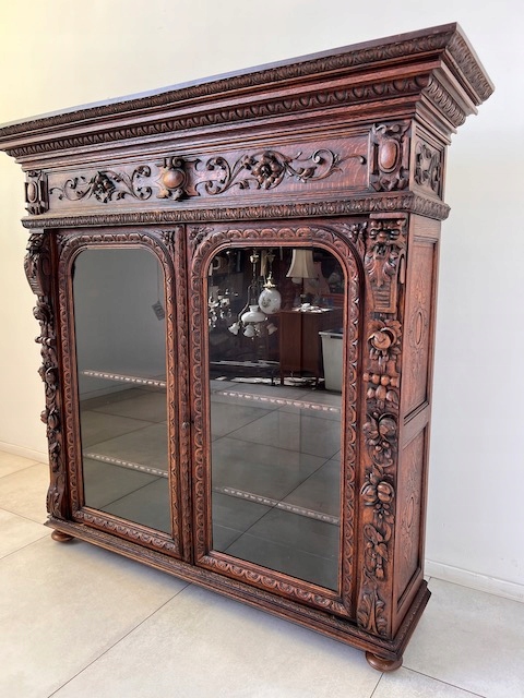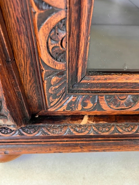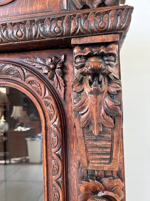 Дубовая витрина. Гламурный; богато украшен растительными и животными мотивами. По моим оценкам, ему около ста лет. Он находится в хорошем состоянии. Имеет характерные следы использования. Замок функциональный, в комплекте есть ключ. Состояние объекта подробно показано на фотографиях. Готов к размещению.