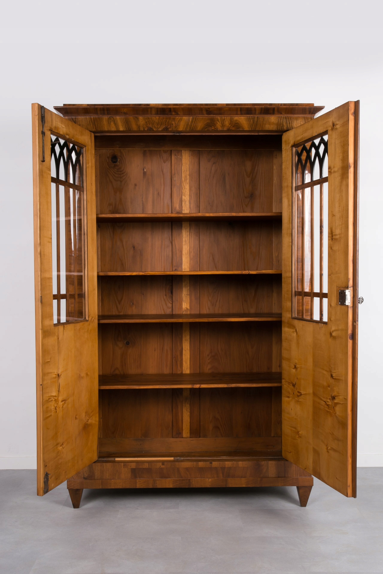 Сайт родом из Германии и был создан в 19 веке. Мебель изготовлена из древесины сосны, покрыта красивой шпоной ореха. Витрина прошла комплексную реконструкцию, очищена от старых покрытий и покрыта полиролью, которая прекрасно защищает и ухаживает за деревом, а также обеспечивает красивый визуальный эффект. Оригинальный дизайн позволяет легко разбирать и собирать мебель. Все элементы соединяются традиционным методом деревянных клиньев. В витрине есть четыре практичные полки. Красивый предмет мебели периода бидермейер, который добавит элегантности и стиля любому интерьеру.