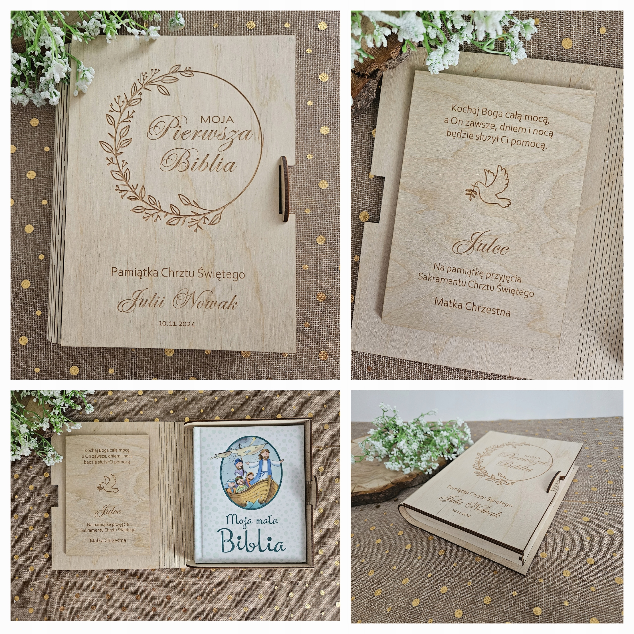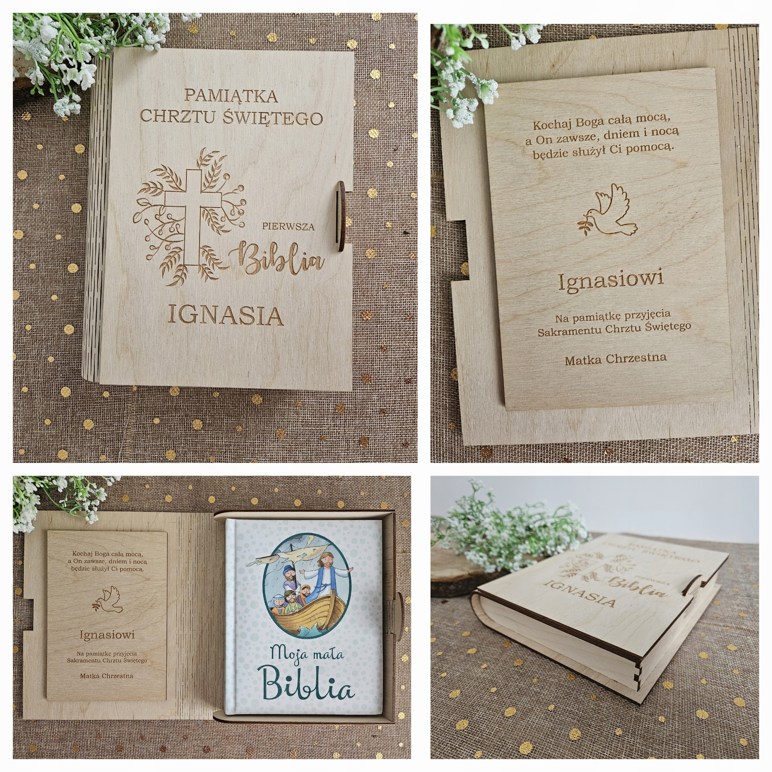 В комплект входит детская Библия с красочными иллюстрациями и коробочка из березовой фанеры толщиной 3 мм. , закрывается на застежку. Вырезан и гравирован точным лазерным методом.