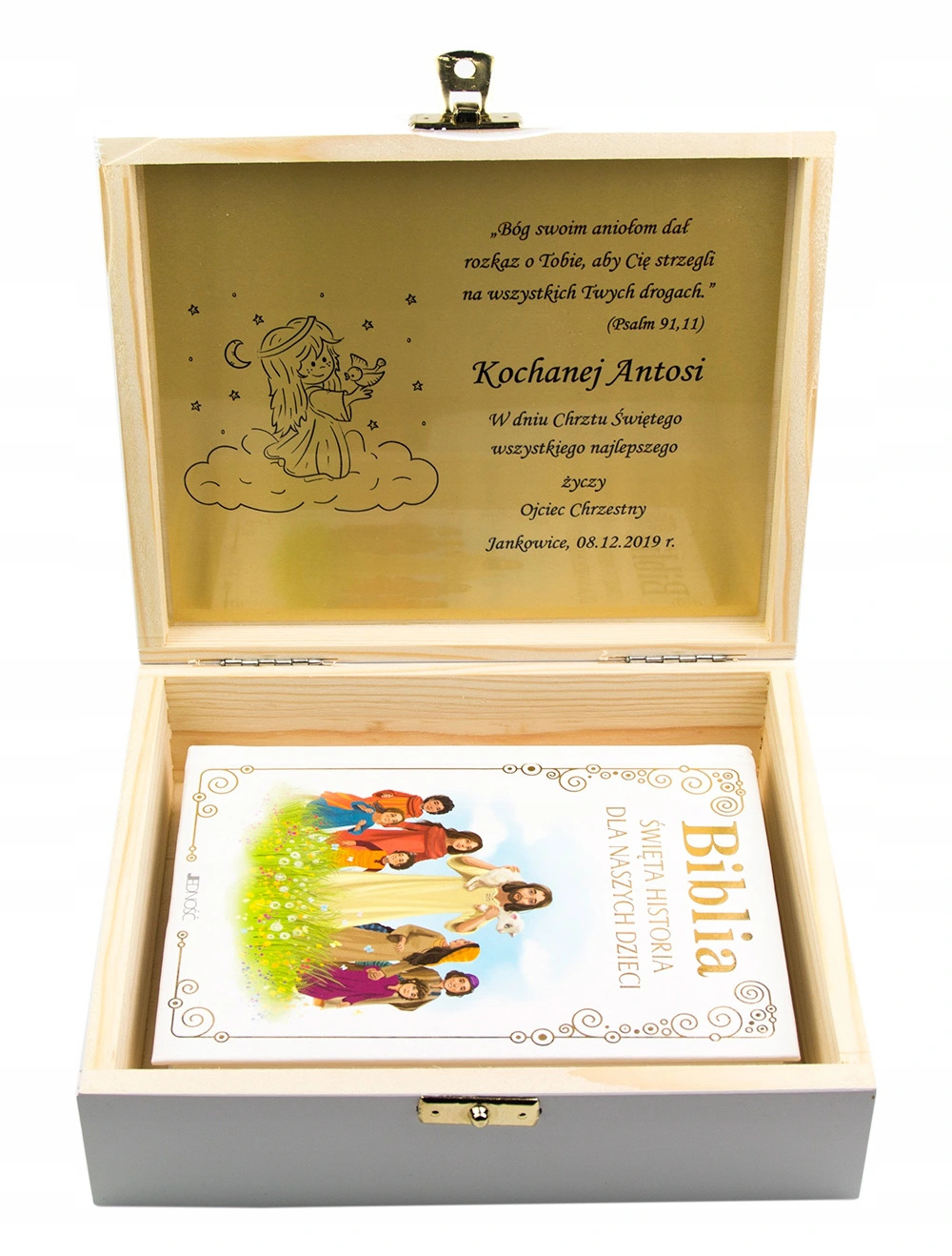 Изготовлен из дерева и окрашен в белый цвет. Она послужит элегантной упаковкой для подарочной Библии, но, прежде всего, вынув Библию, ребенок сможет легко положить в коробку свои самые важные вещи. Деревянная шкатулка с гравировкой-подарок на долгие годы. Элегантность и практичность – прежде всего!