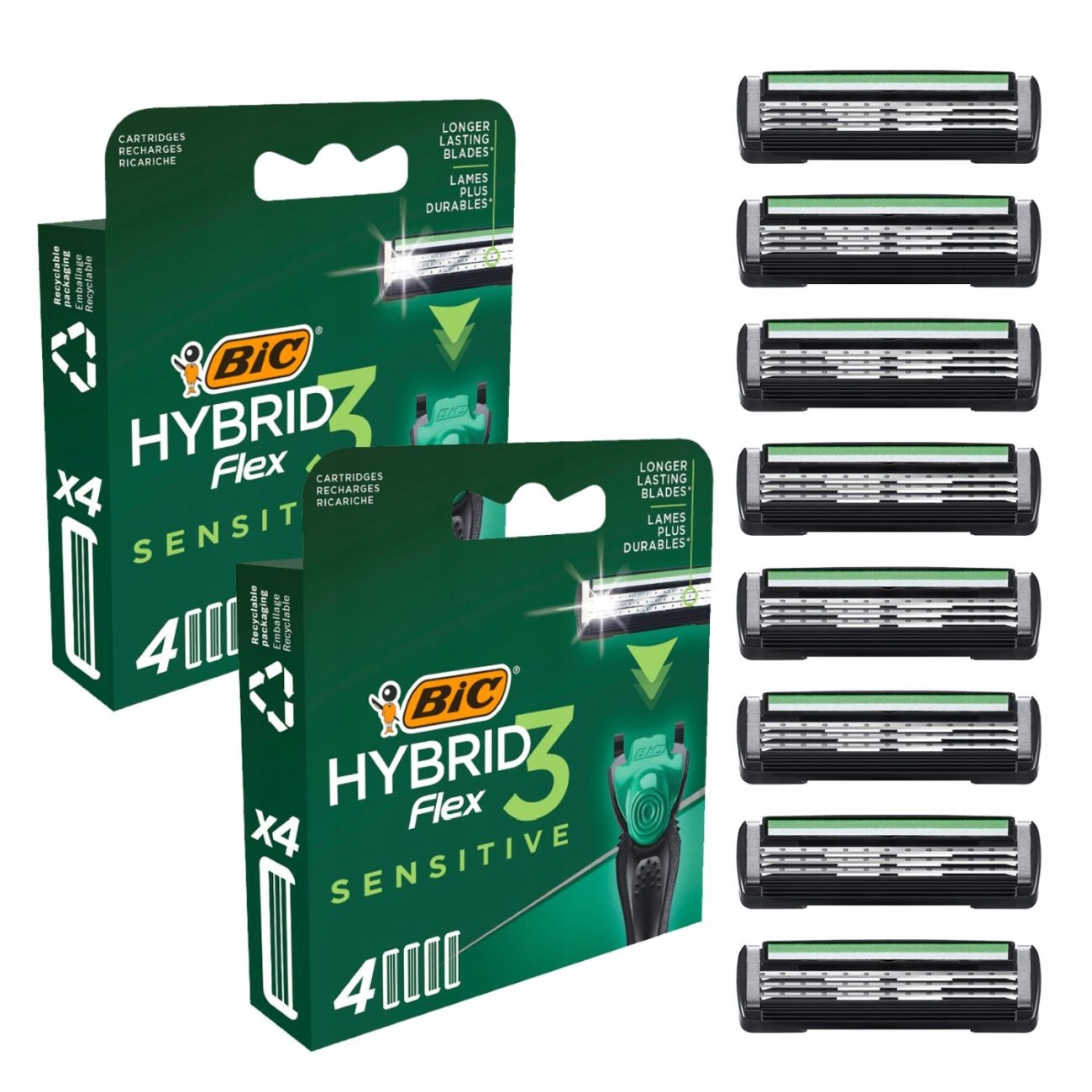 - В комплект входят 8 сменных картриджейдля мужской бритвыBIC Hybrid 3 Flex Sensitive