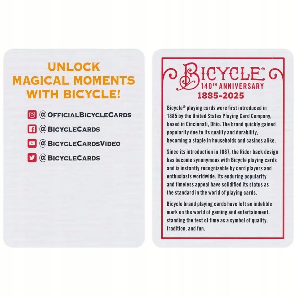 Игровые карты 140 -й годовщины, были созданы игровой компанией Соединенных Штатов (USTCC) по случаю 140 -й юбилейной бренды Bicycle, отмеченной в 2025 год. Эта талия сочетает в себе классический стиль с современными технологиями, отдавая дань уважения богатой истории бренда.