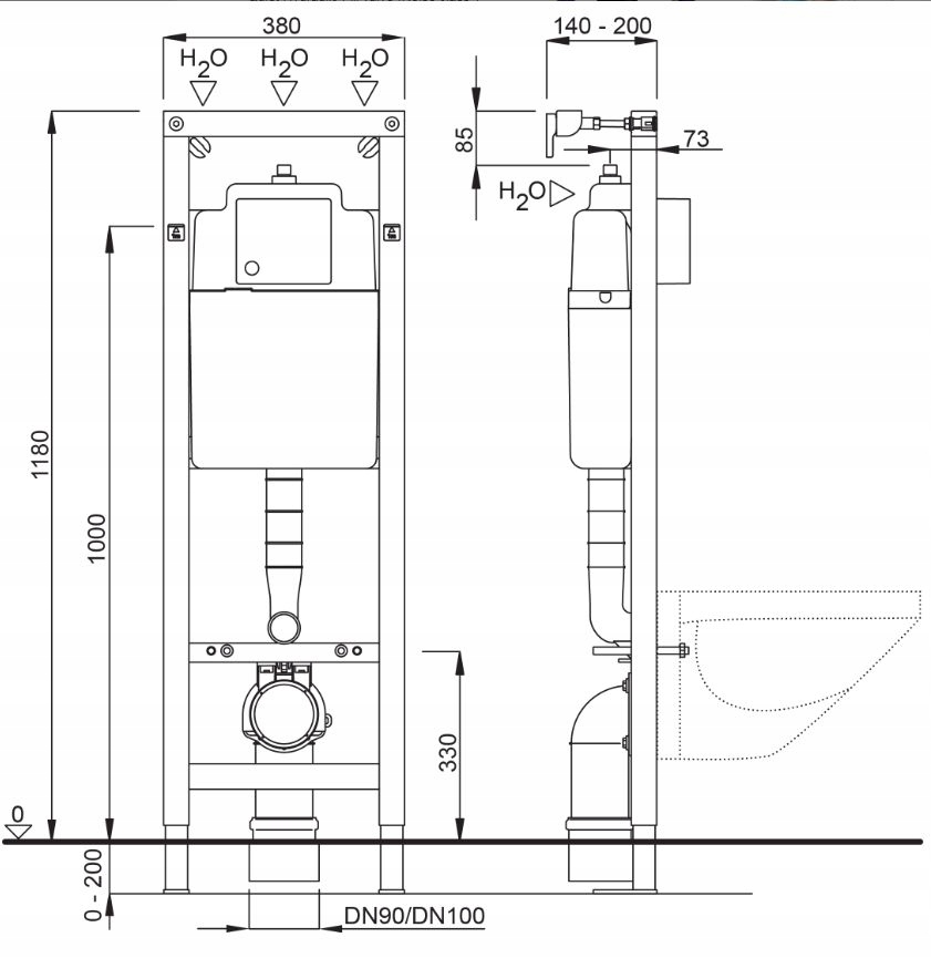 Опора, синий унитазный элемент, квадратный профиль 40х40 мм с бачком 380 UP заводской сборки