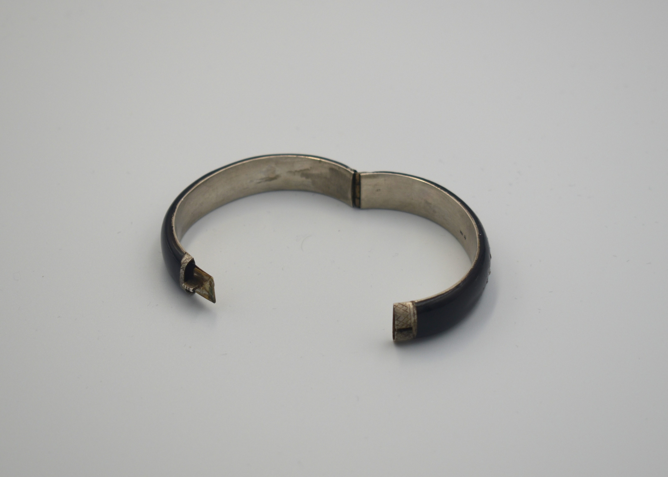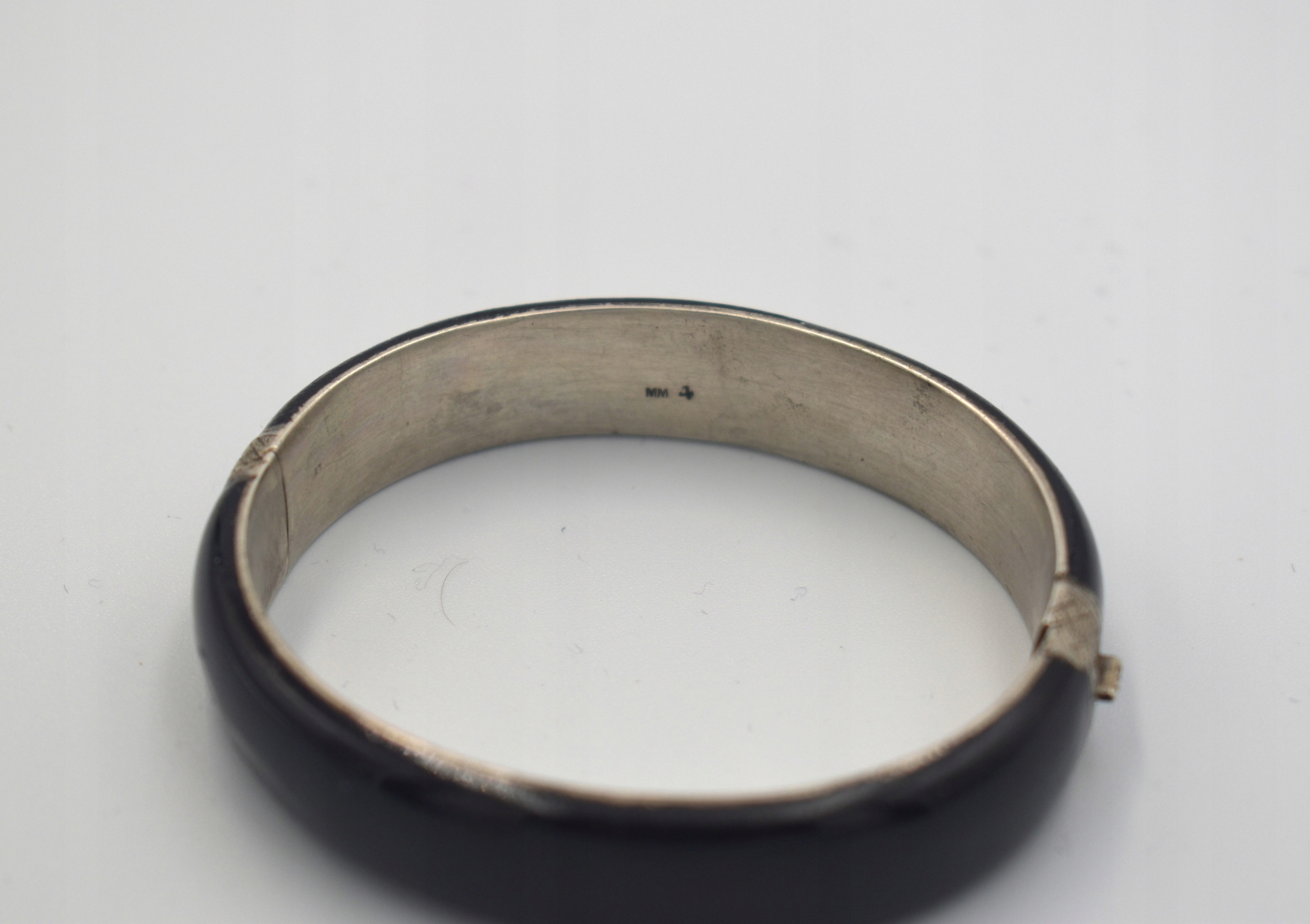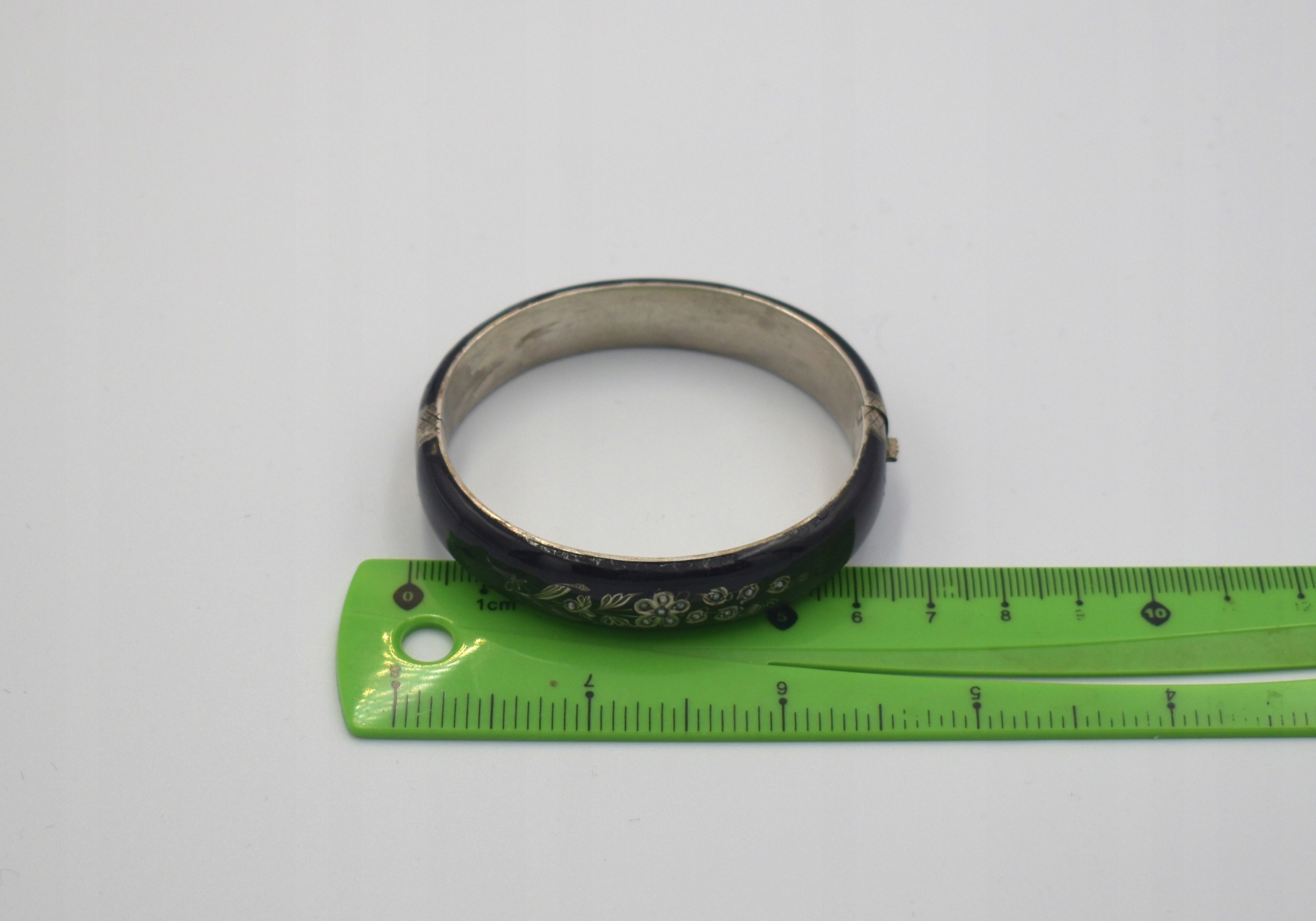Серебряный браслет, покрытый черной эмалью и украшенный цветочным мотивом с небольшими половинами.