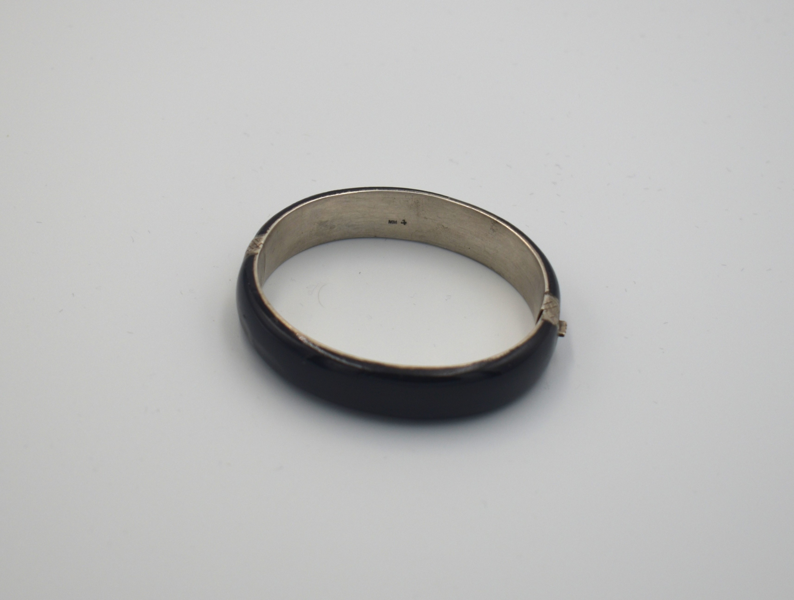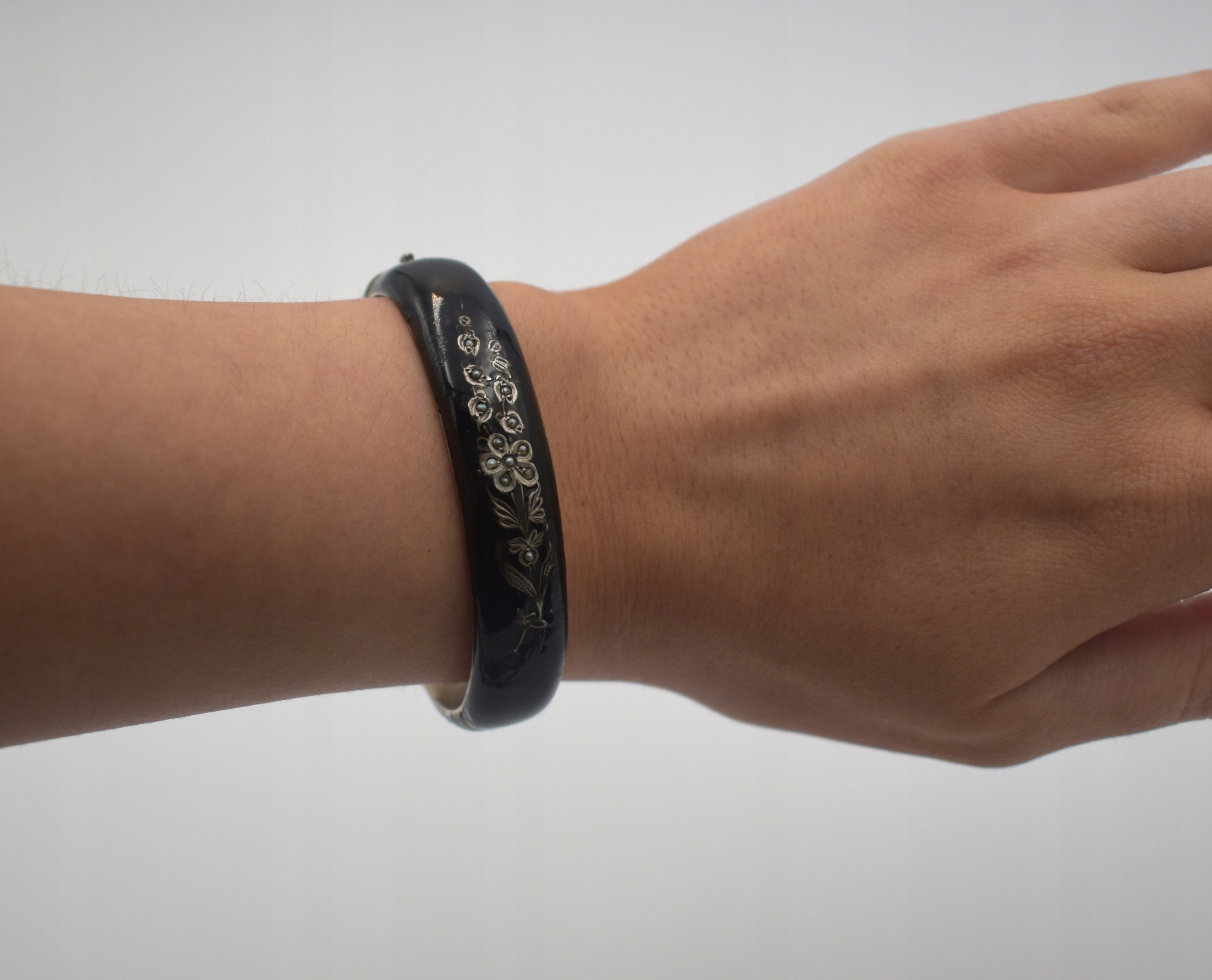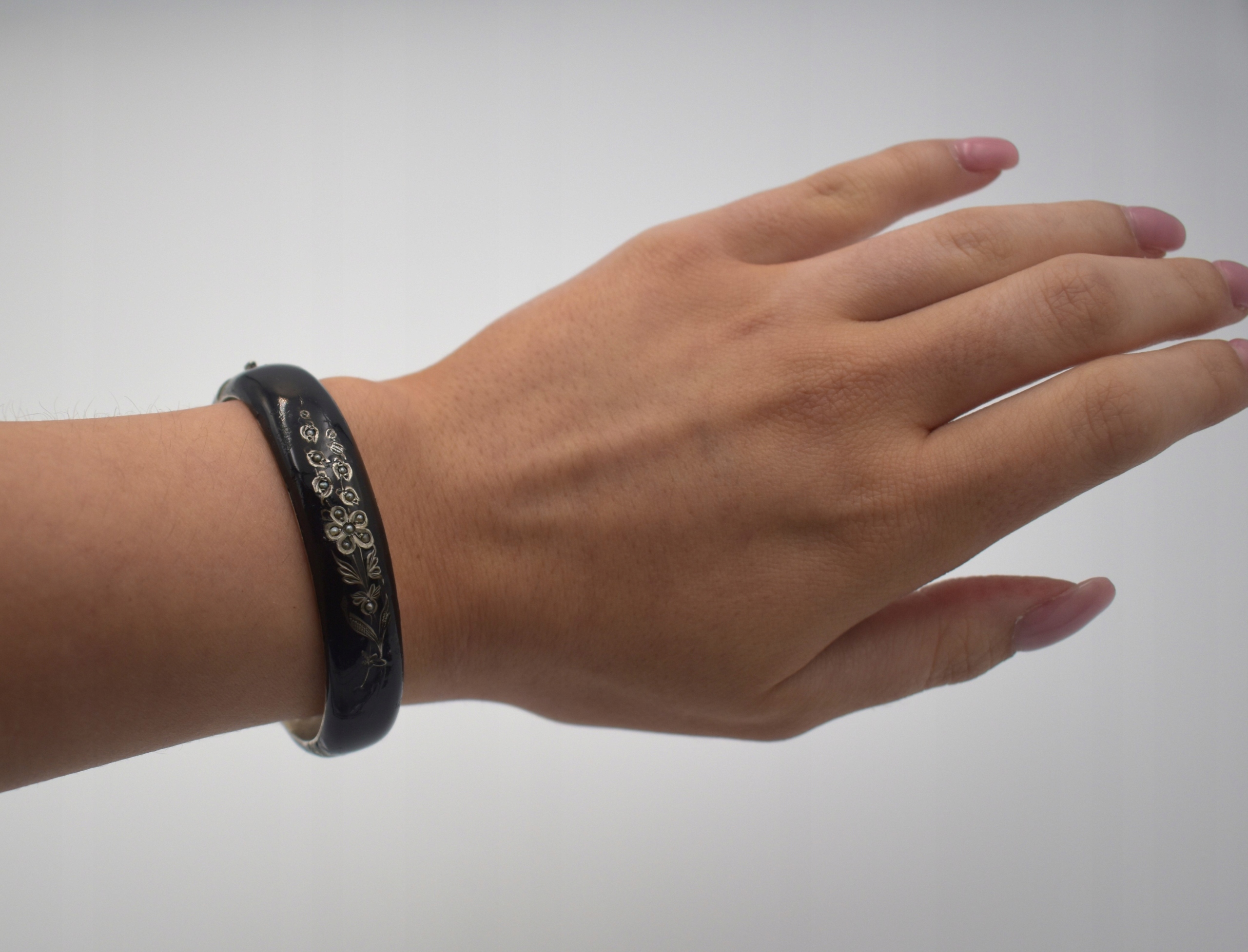 Серебряный браслет, покрытый черной эмалью и украшенный цветочным мотивом с небольшими половинами.