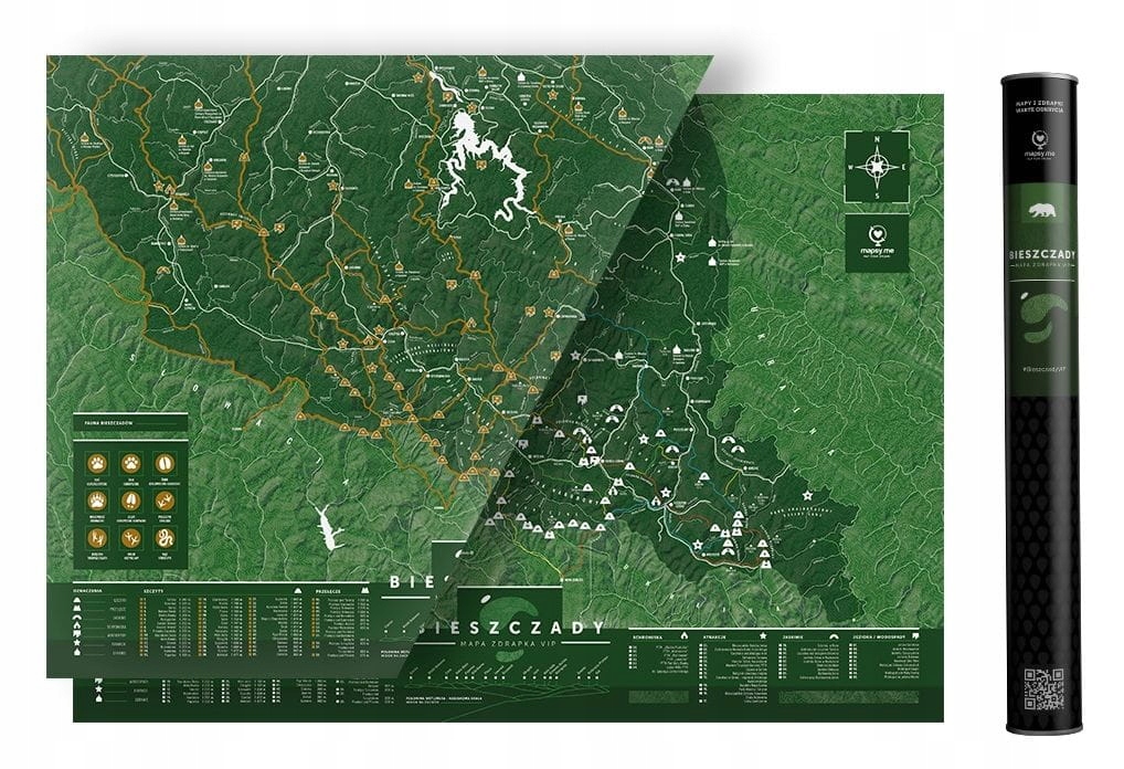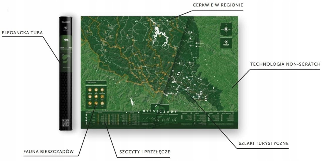 На скретч-карте отмечены самые интересные места в Бещадах. Под картой есть чек-лист, благодаря которому вы можете увидеть, сколько мест еще осталось на свободе. Карта Бещад выглядит великолепно как до, так и после открытия скретч-карты.