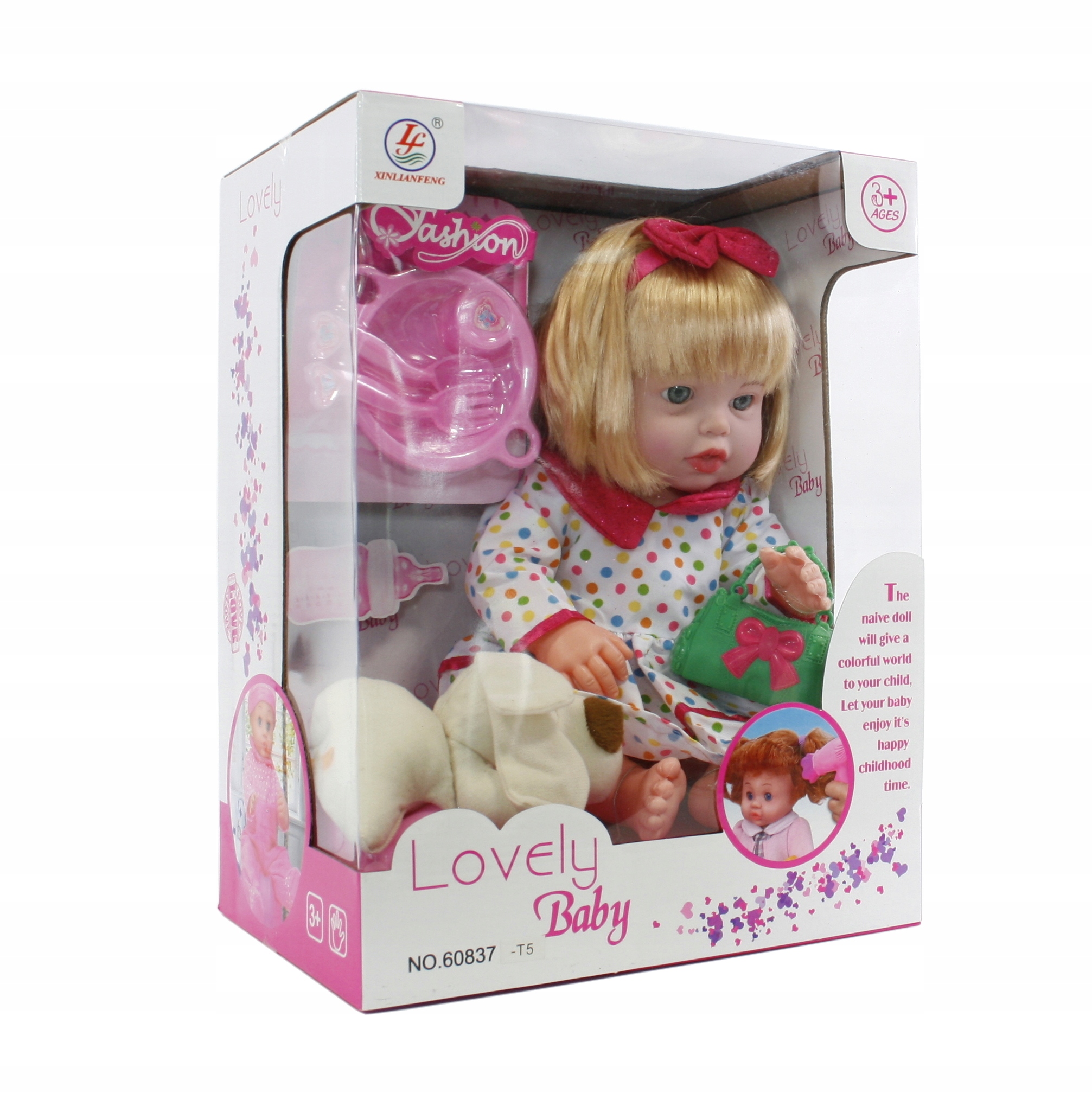На животе куклы имеется механизм, издающий звуки при нажатии (батарейки в комплекте).