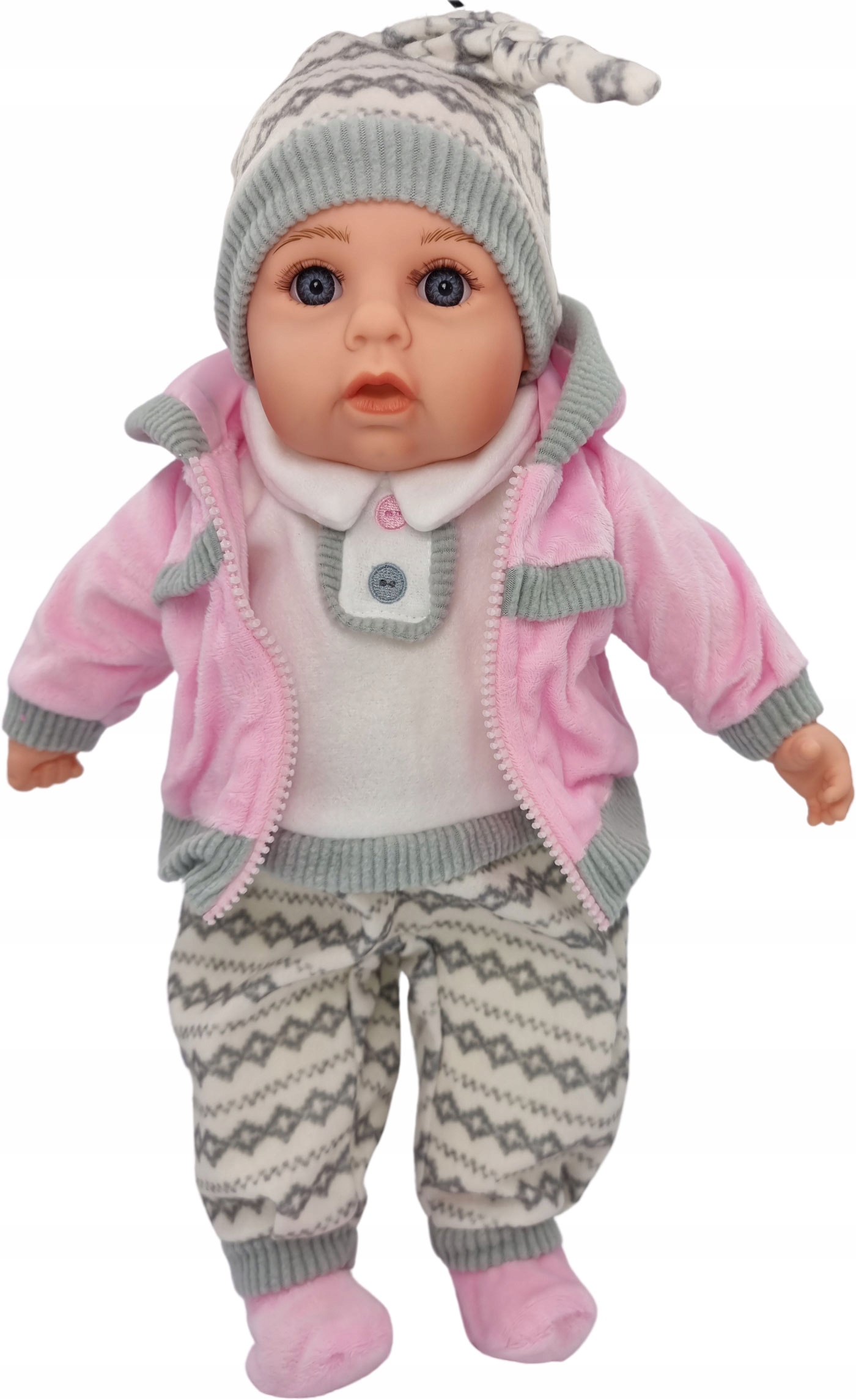 Она одета в мягкий, красочный флисовый наряд, в комплекте с носками и шапочкой, очень аккуратно сшитой.