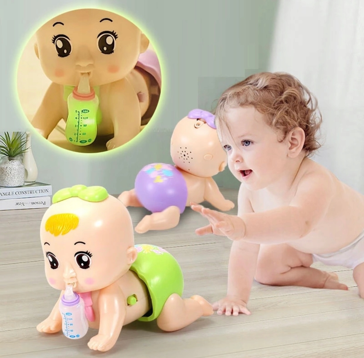 Как приучить ребенка ползать? Нет ничего проще – покажите ему ползающего малыша. Игрушка светится и издает звуки, что дополнительно побуждает ребенка поймать игрушку. Чтобы поймать непослушного малыша, малыш с удовольствием сначала ползет, потом идет и, наконец, бегает.