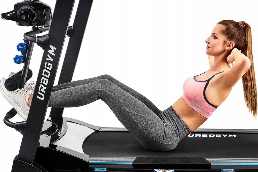 Беговая дорожка имеет специальную конструкцию, которая служит устройством для тренировки мышц живота. Удобные ручки помогают при выполнении данного вида упражнений. Дополнительно есть куда положить гантели*, входящие в комплект.