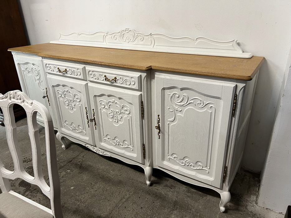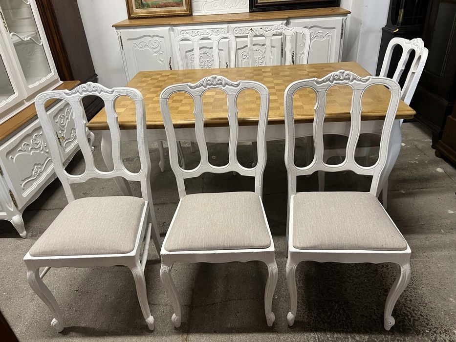 Предмет продажи — красивая столовая после ремонта, состоящая из; Шкаф-витрина, комод, раздвижной стол с 6 стульями. Состояние как новый. Мебель подвергнута пескоструйной обработке, окрашена в белый цвет, столешница покрыта лаком. Возможность покупки в рассрочку. Возможен транспорт или личный самовывоз. Товар доступен в магазине в Пионках.