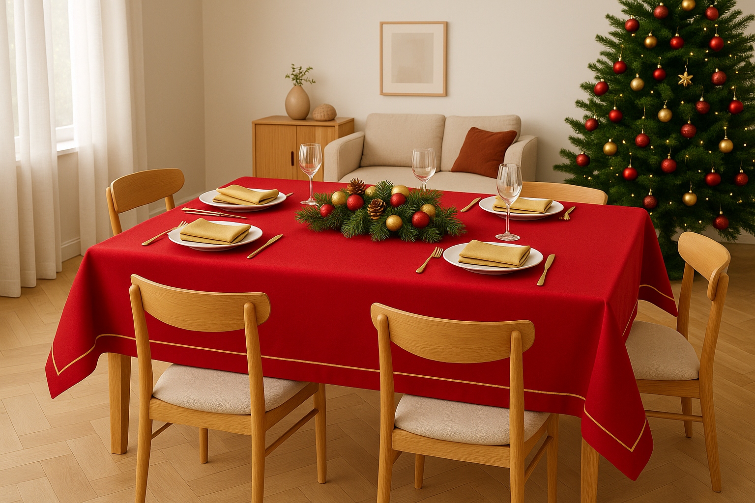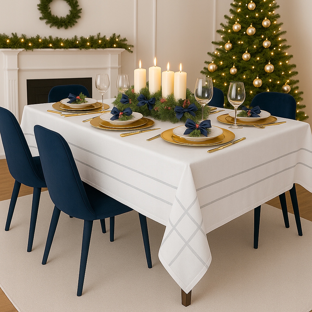 ⏺ Эта скатерть отлично смотрится с серебряной или зеленой посудой, зелеными салфетками и красными, серебряными или белыми свечами.